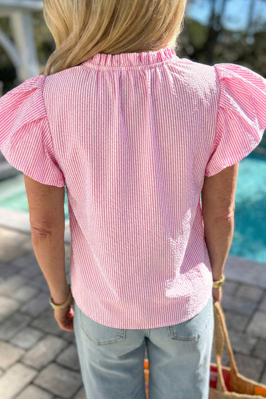 Rose Stripe Short Bubble Sleeve Split V Neck Blouse
