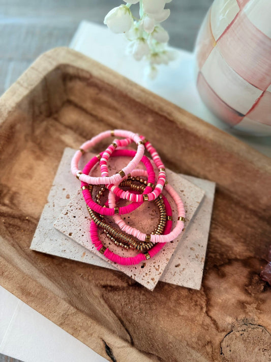 Bright Pink 7pcs Gold Plated Clay Beading Multi Layered Bracelet Set