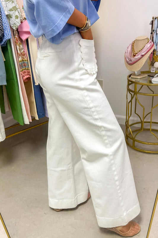 White Solid Color Scalloped Patch Pocket Shift Jeans - PREORDER