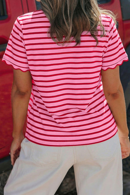 Pink Stripe Scalloped Trim Round Neck T Shirt - PREORDER