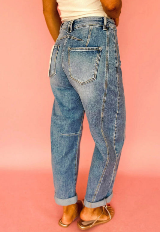 Denim Exposed Stitch Detail Drawstring Barrel Jeans