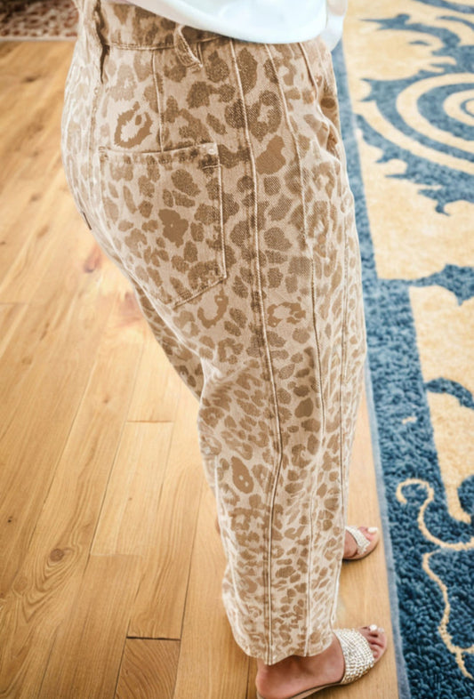 Khaki Leopard Print Straight Loose Jeans - PREORDER