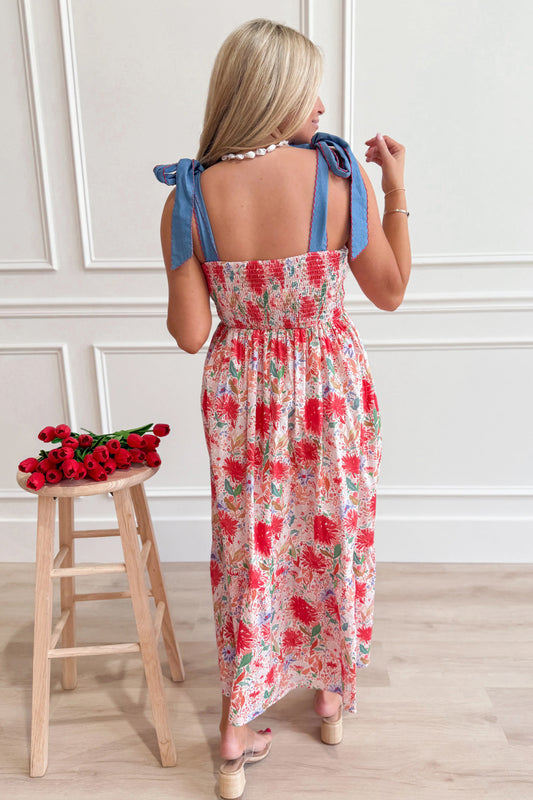 Red Floral Print Contrast Stitched Knot Denim Straps High Waist Dress - PREORDER