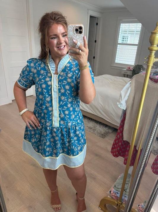 Blue Striped Trim Half Buttons Short Sleeve Floral Dress