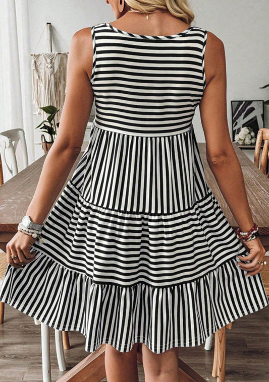 Black Stripe U Neck Sleeveless Loose Fit Mini Dress - PREORDER