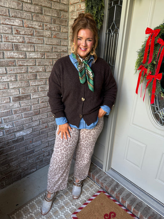 Khaki Leopard Print Color Block Trim Button Down Oversize Sweater Cardigan