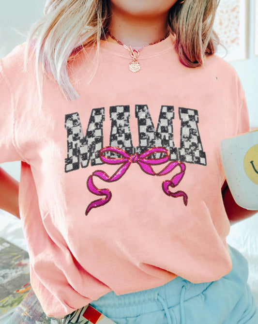 Pink Sequin Checkered MAMA Bow Graphic T Shirt