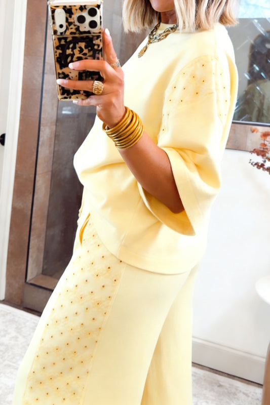 Yellow Cream Solid Color Eyelet Lace Patchwork Oversize Tee Drawstring Loose Pants 2pcs Outfit - PREOREDER