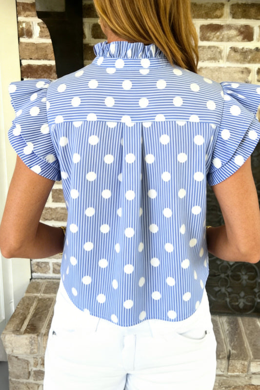 Sky Blue Stripe Contrast Polka Dot Print Pleated Ruffle Sleeve Shirt - PREORDER