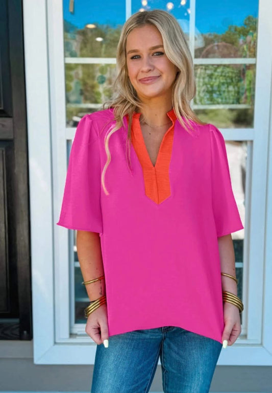 Pink Contrast V Neck Colorblock Wide Short Sleeve Top
