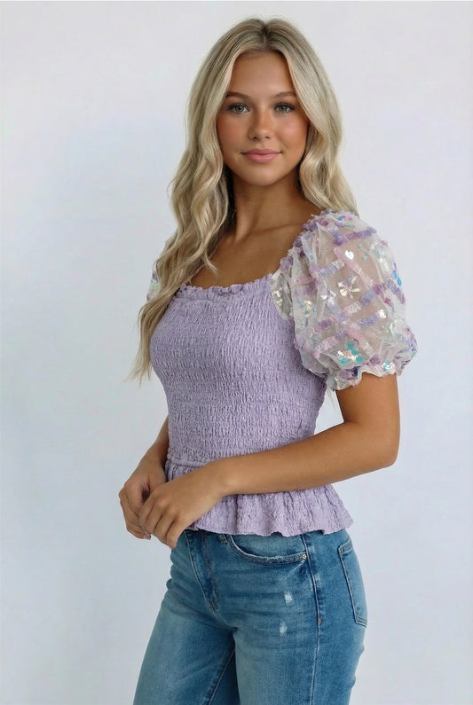 Lavender Square Neck Smocking Sequins Sleeve Top - PREORDER
