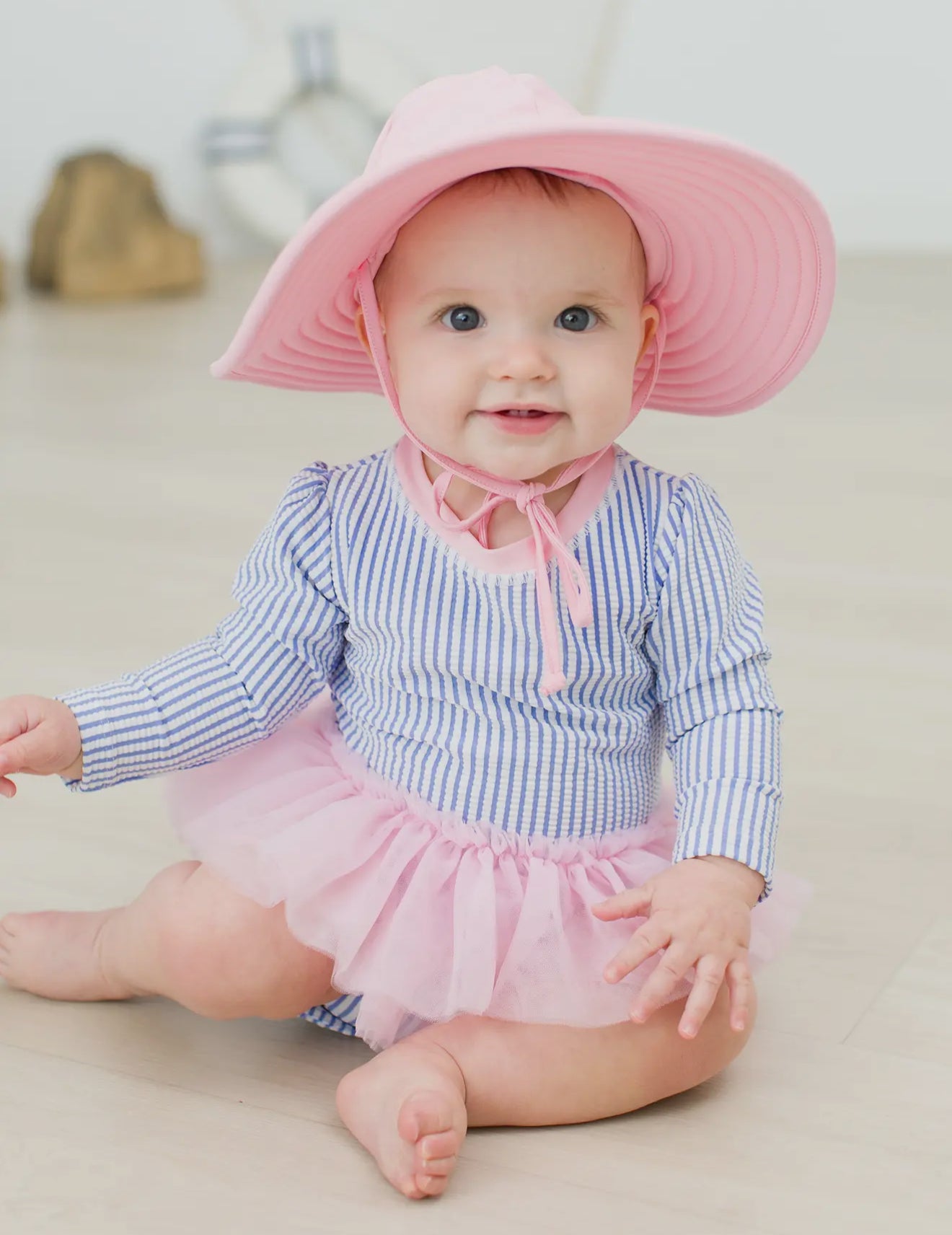 Experience the ultimate protection and style for your baby girl with our Periwinkle Blue Seersucker Tulle Skirted One Piece Rash Guard. The soft seersucker fabric and elegant tulle skirt will keep her comfortable and looking adorable while she plays in the sun. Protect her delicate skin with confidence and style!