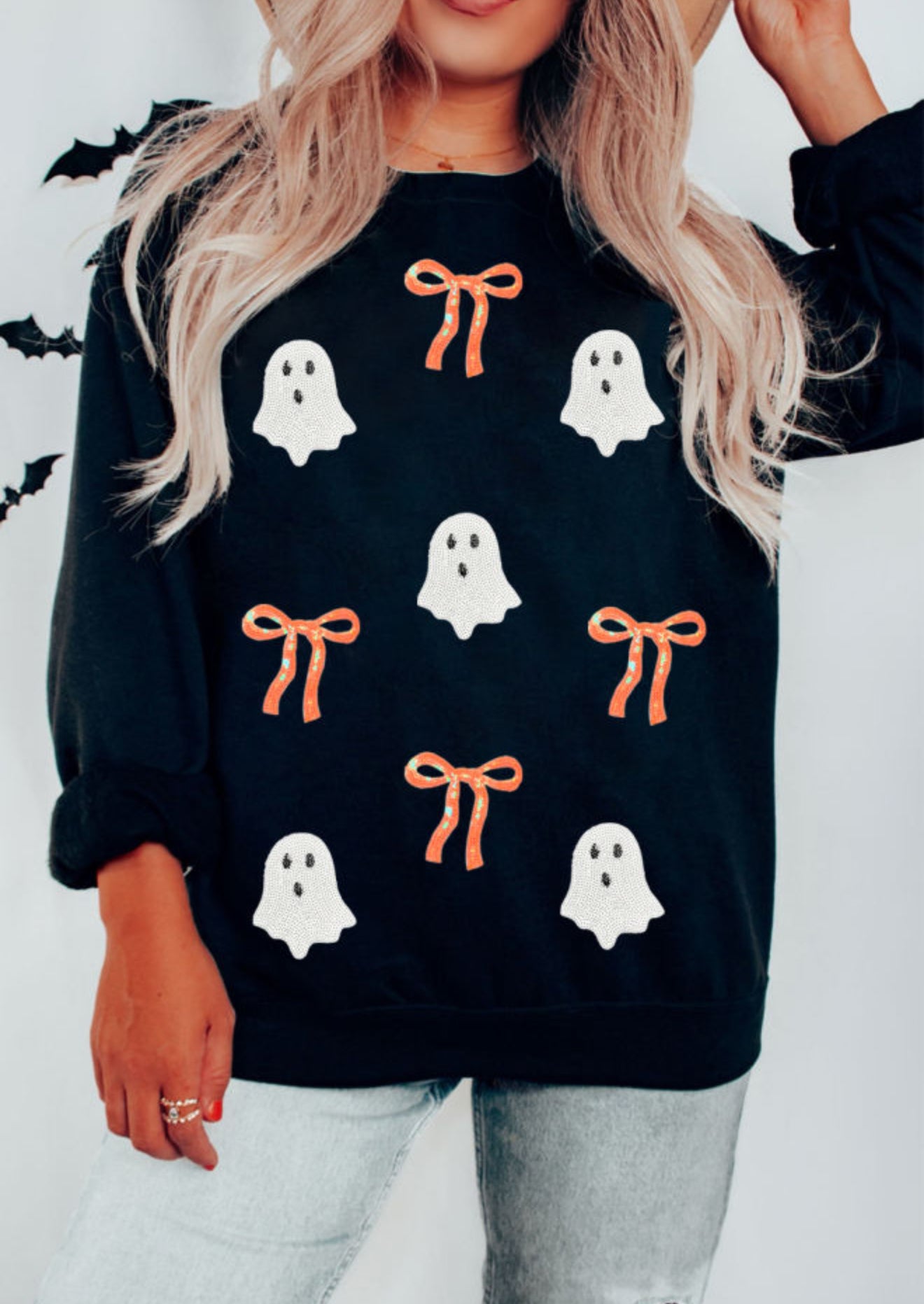 Black Halloween Ghost Bow Sequin Patched Drop Shoulder Sweatshirt