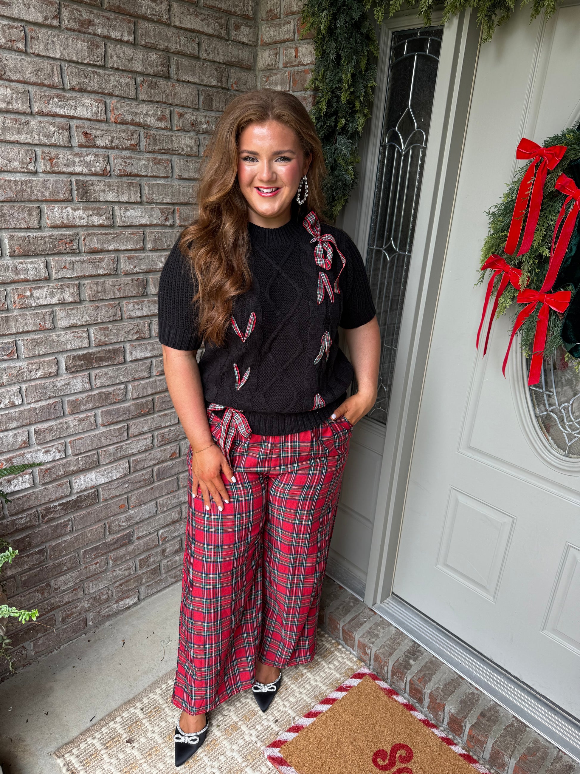 Black Plaid Lace up Detail Christmas Holiday Puff Short Sleeve Sweater - PREORDER