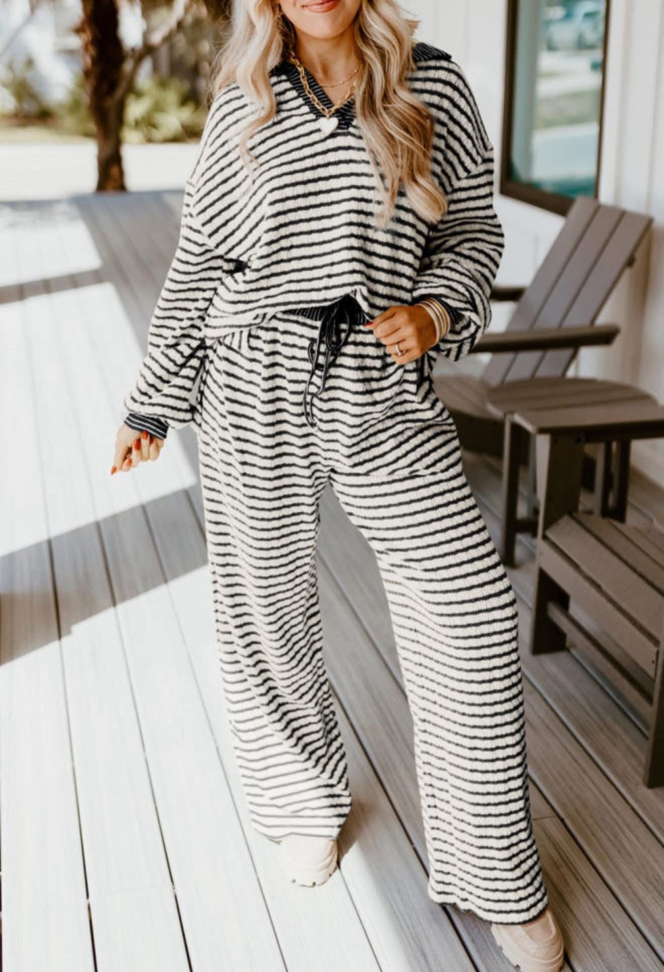 Black Stripe Collared Pullover Top and Drawstring Pant Set