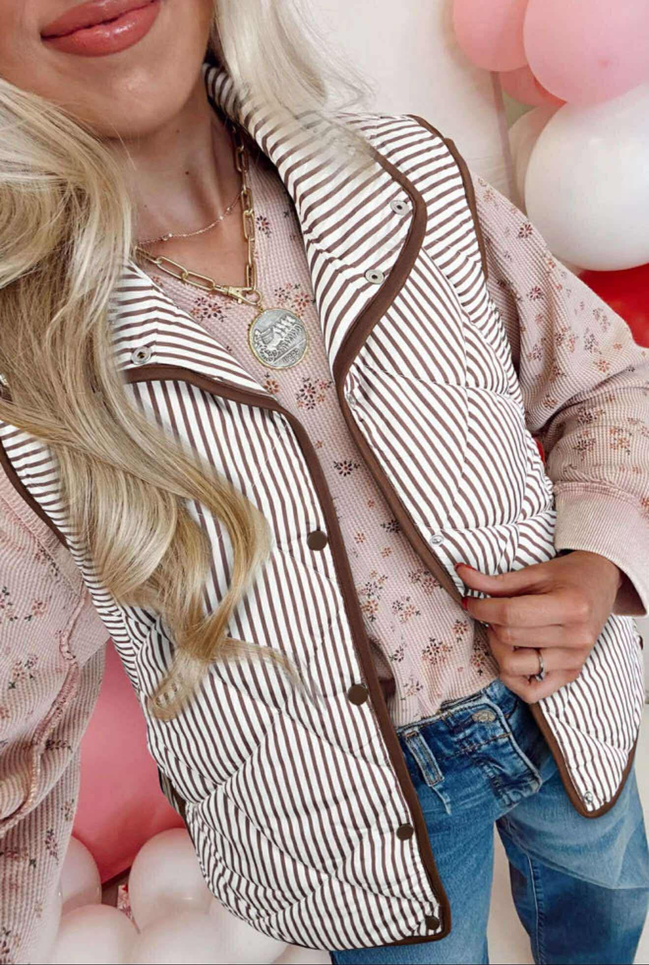 Brown Stripe Snap Button Collared Winter Vest - PREORDER