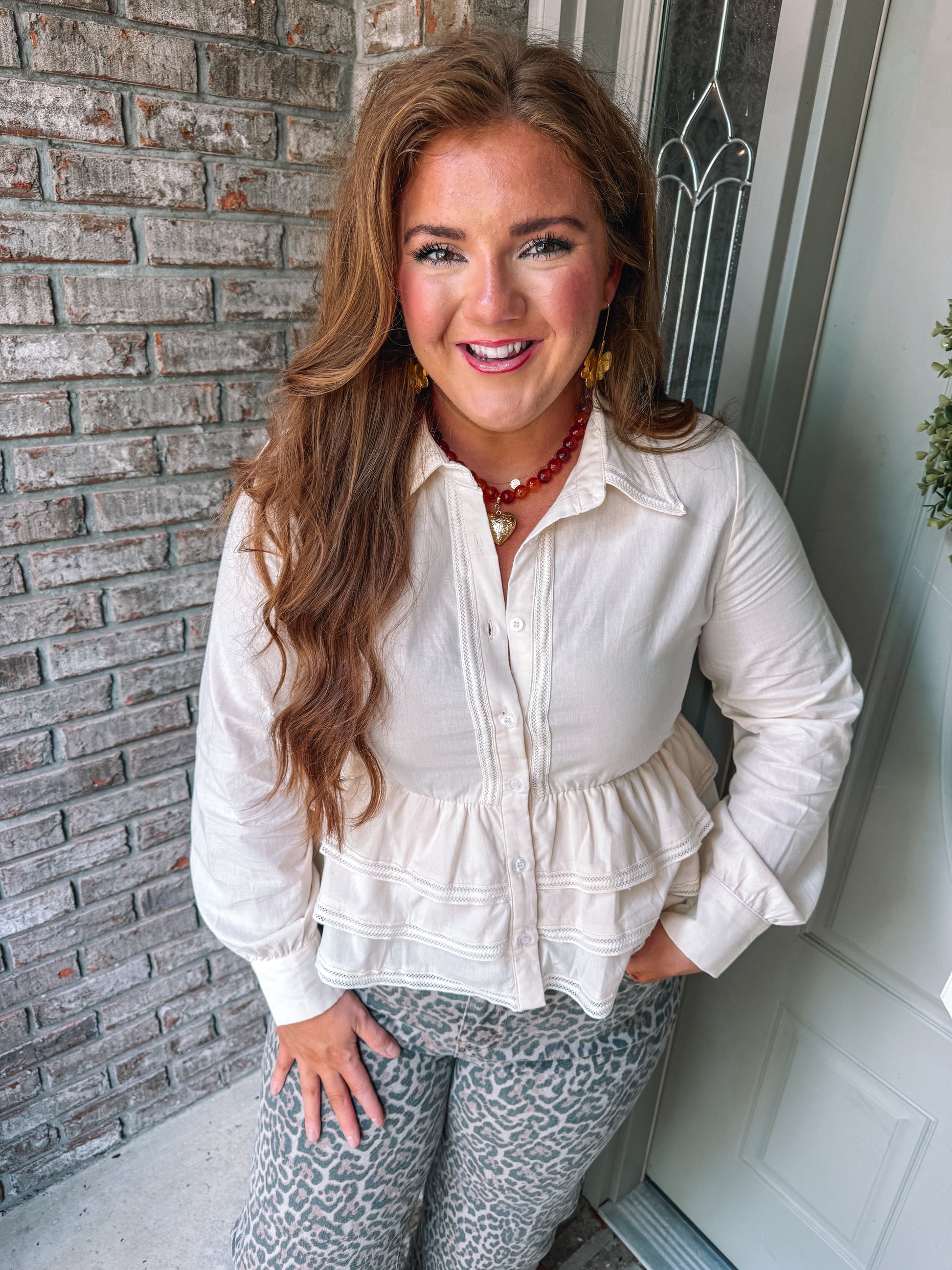 Button Up Long Sleeve Peplum Waist Top