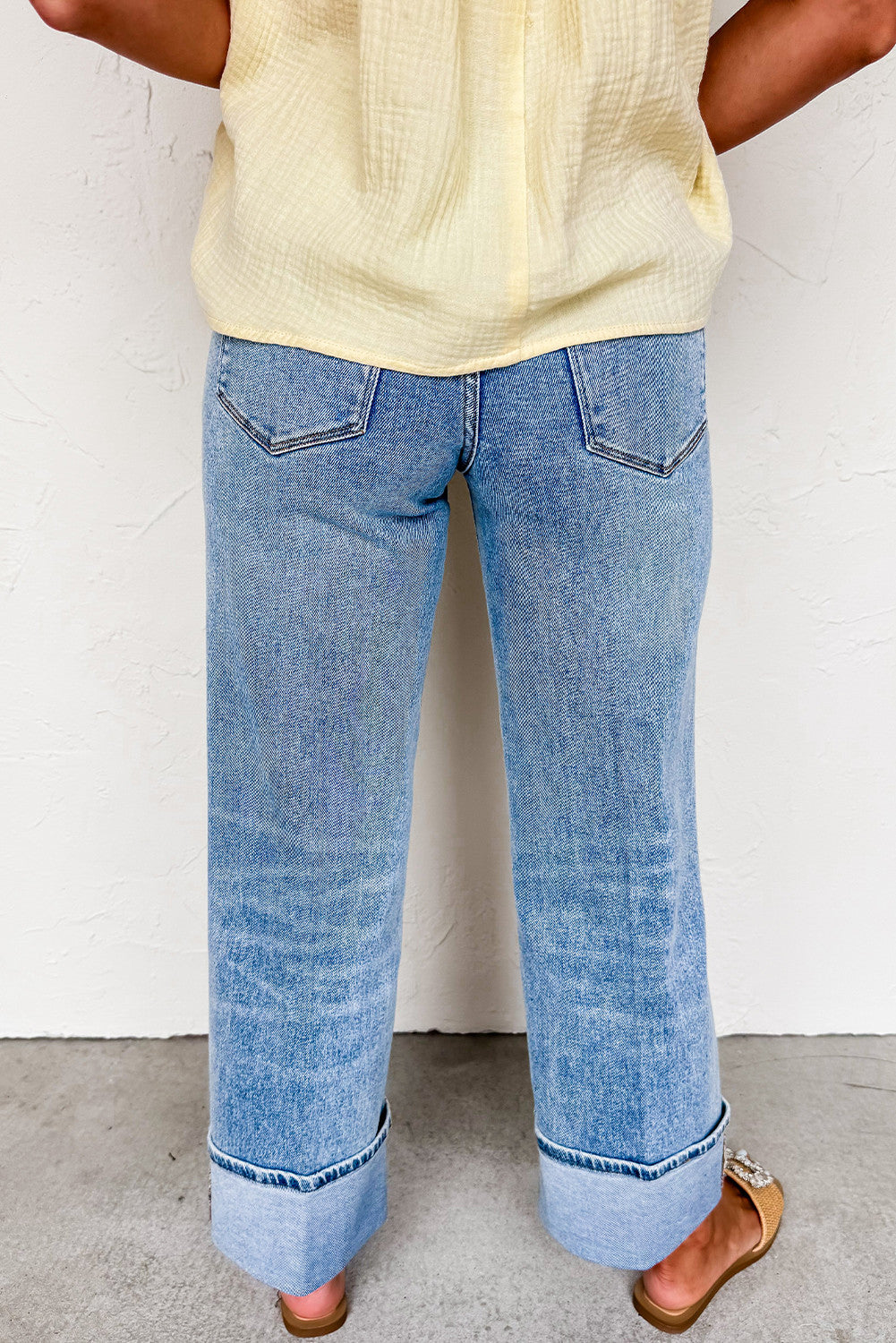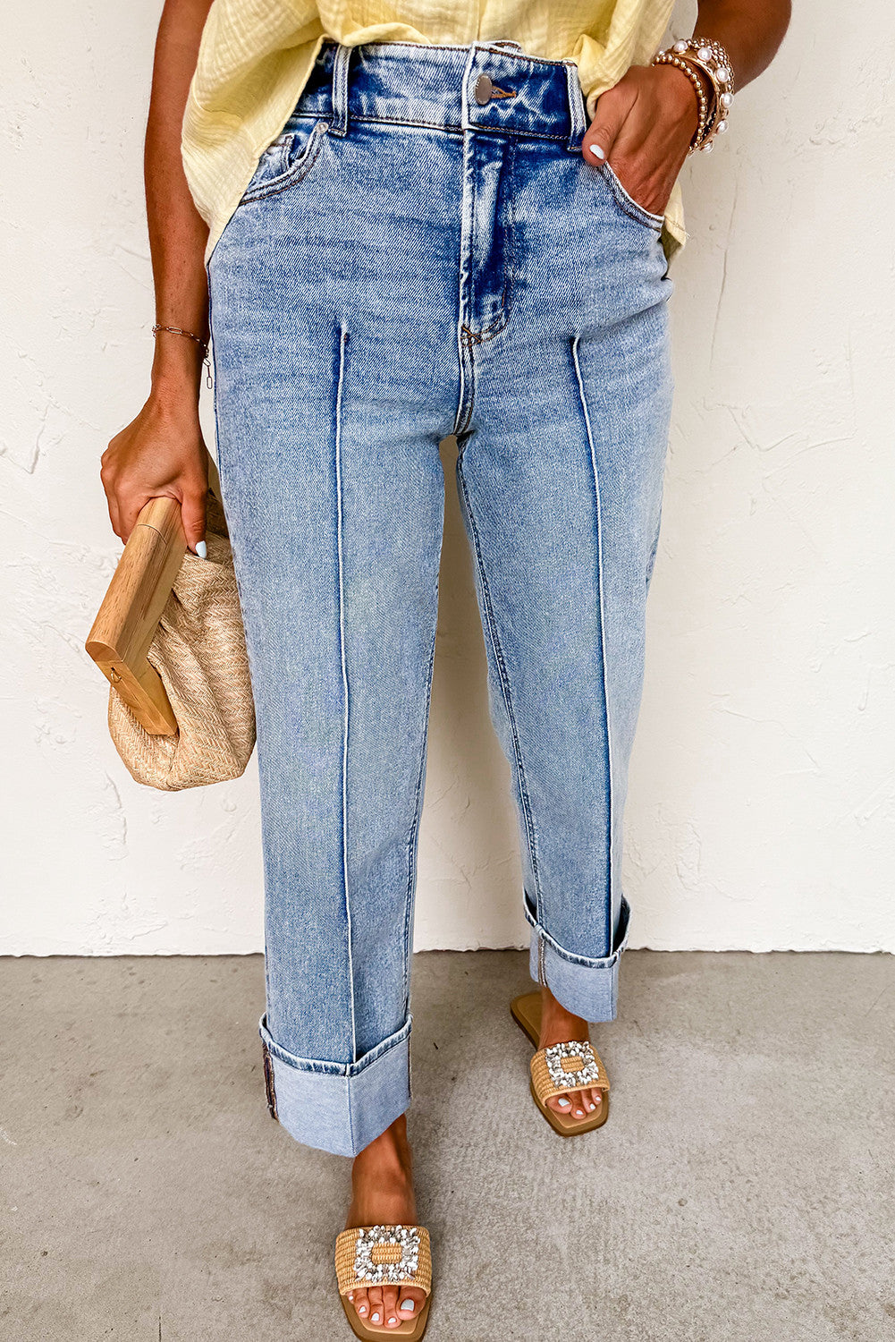 Denim Center Seam Cuffed Hem Straight High Waist Jeans