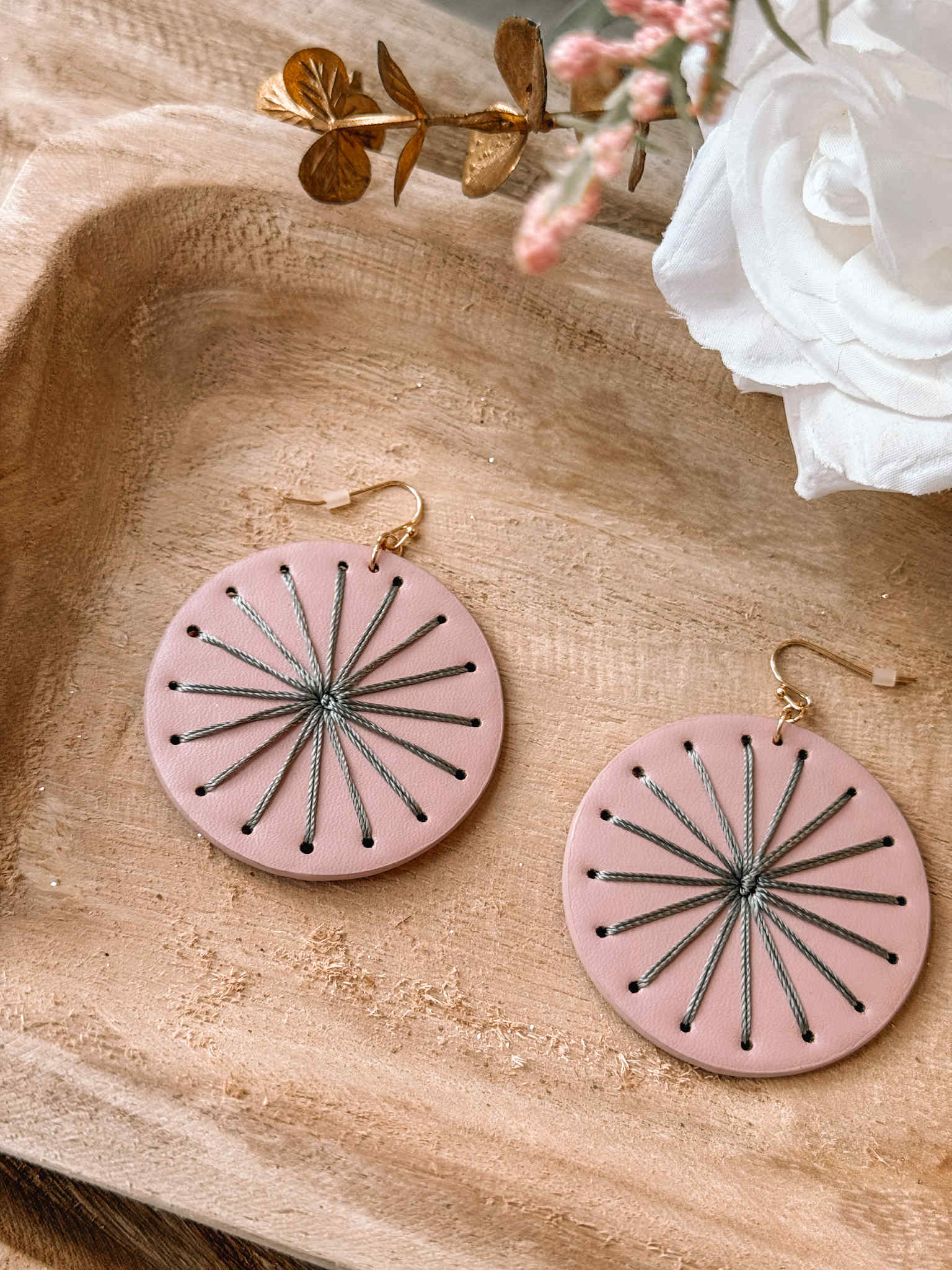 Elevate your style with the Dusty Earrings, blending boho charm and delicate femininity. Featuring 2.5" mauve faux leather circles stitched in a unique lavender wagon wheel pattern, these earrings offer a handcrafted artisan appeal. Their lightweight design ensures all-day comfort, while nickel-safe gold hardware guarantees safe, stylish wear. Perfect for adding a touch of western-inspired elegance or effortless boho flair, the Dusty Earrings are a must-have accessory to enhance any outfit.
