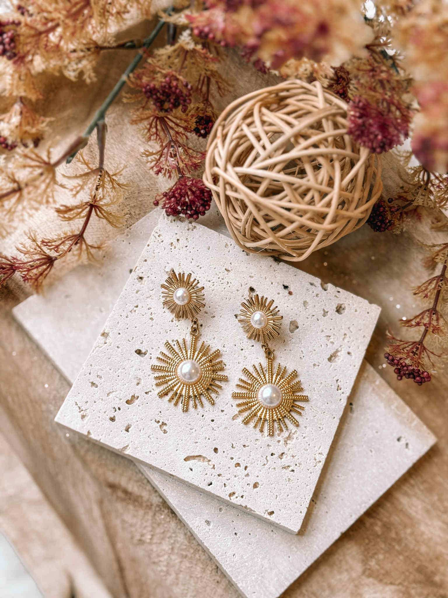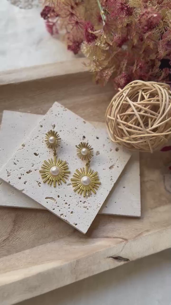 Elevate your style with the Elowen Earrings, crafted from radiant gold stainless steel for lasting shine. These 2" statement earrings feature a unique double burst design with intricate texture and a lustrous faux pearl at the center, blending boldness with feminine elegance. The secure twist-on disc closure ensures comfortable, worry-free wear. Perfect for adding a glamorous touch to any outfit, the Elowen Earrings transform everyday looks into unforgettable ensembles.