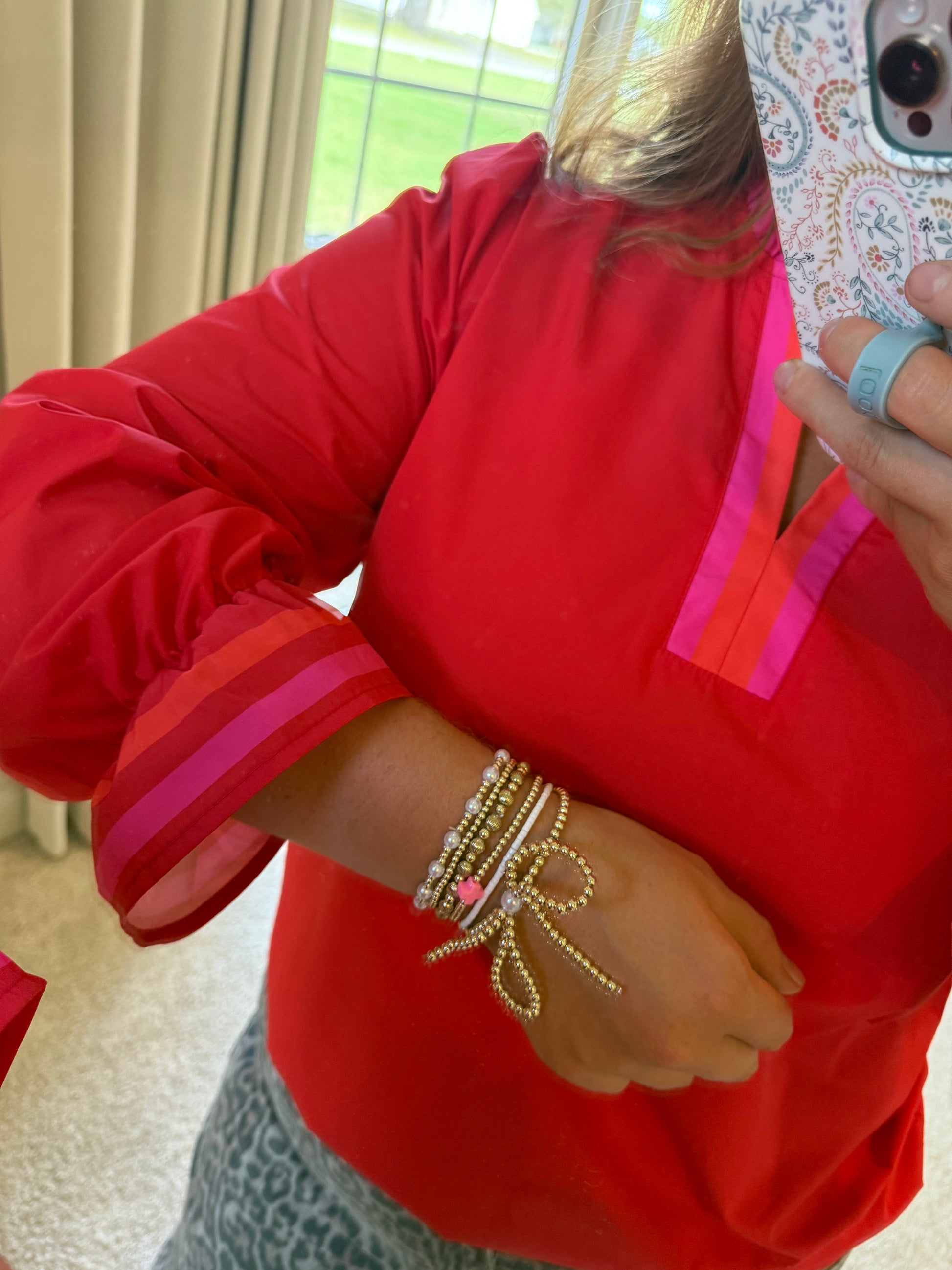 Fiery Red Striped Trim Ruffle Split Neck Long Sleeve Blouse - PREORDER