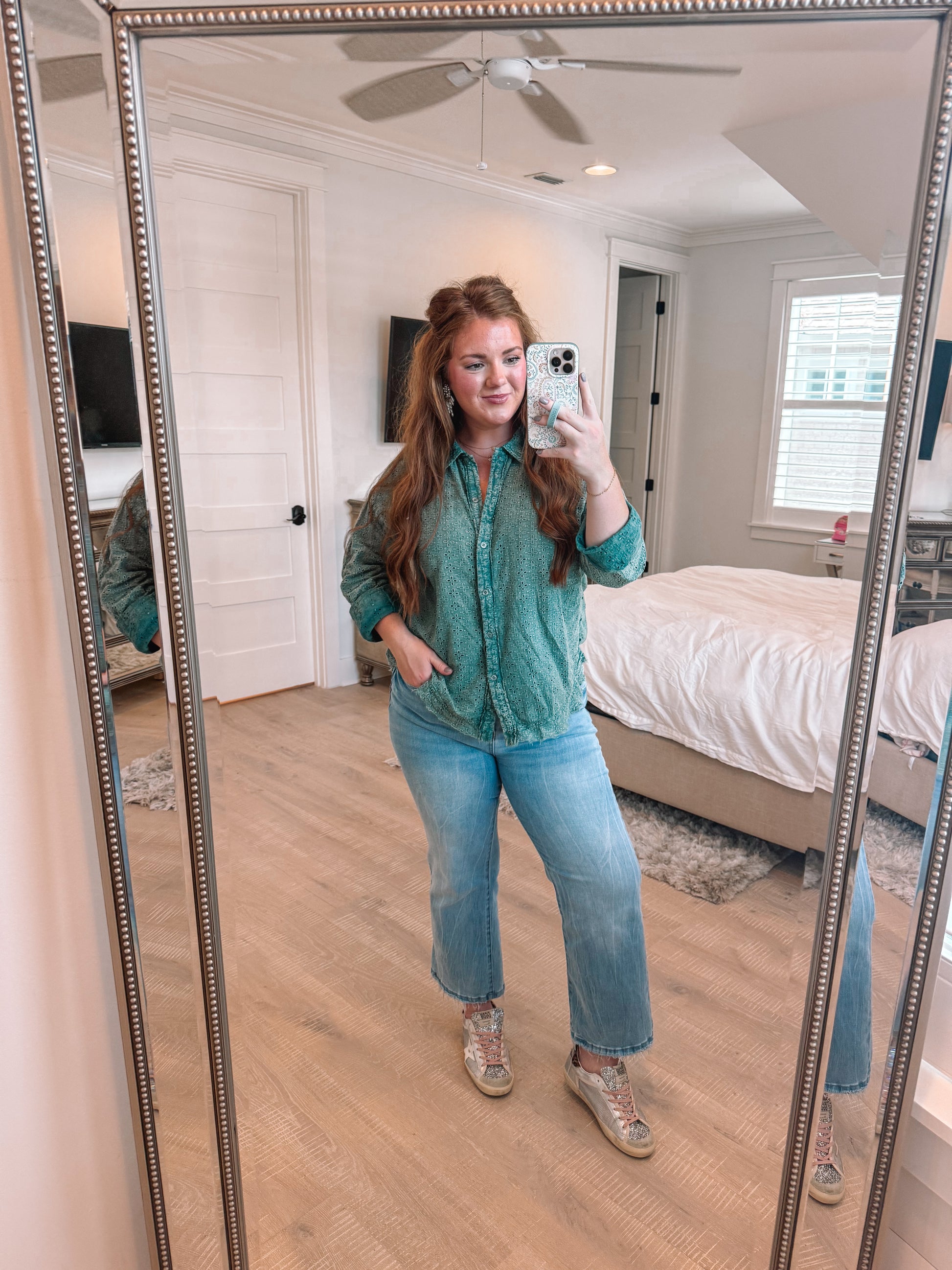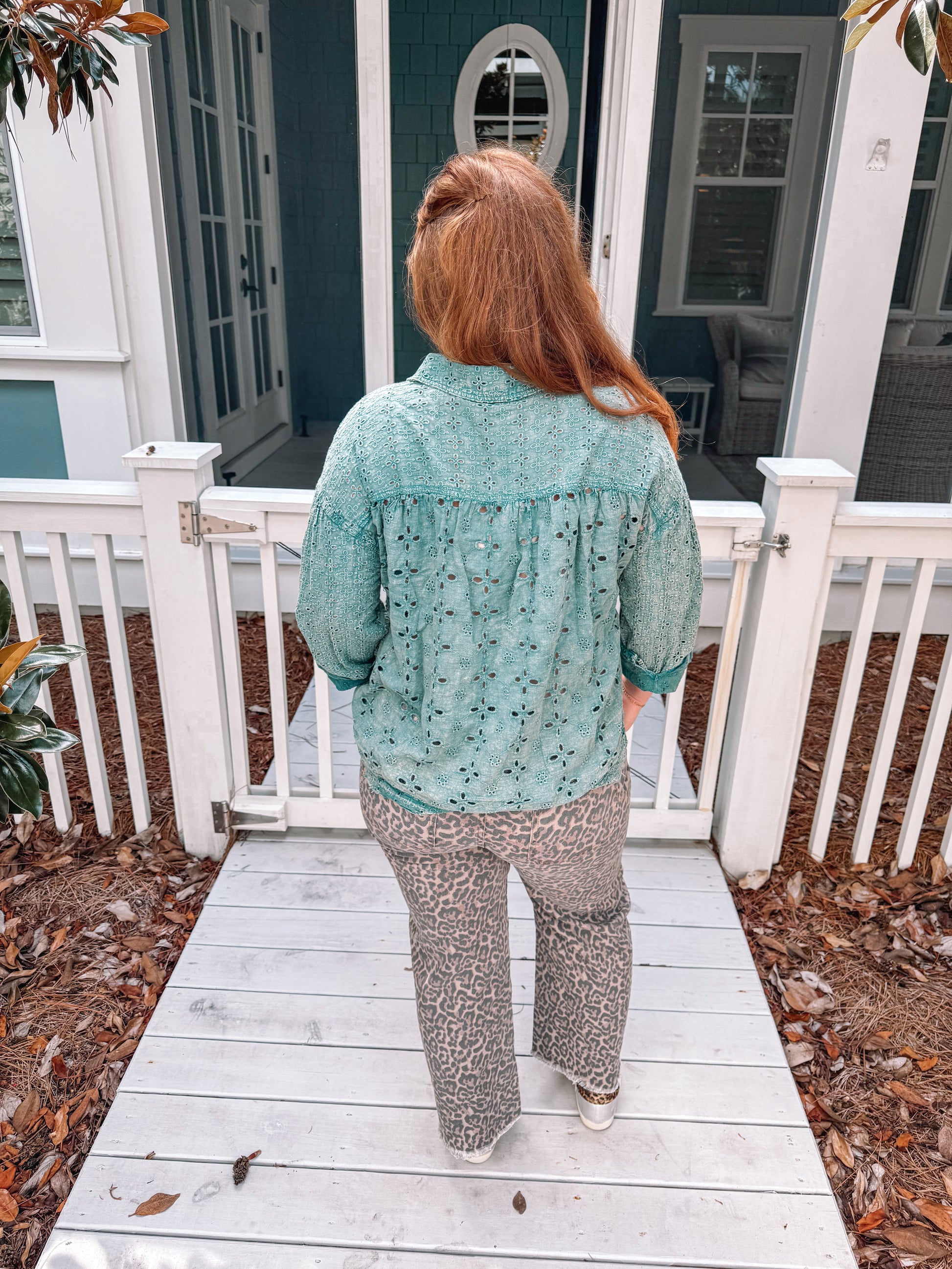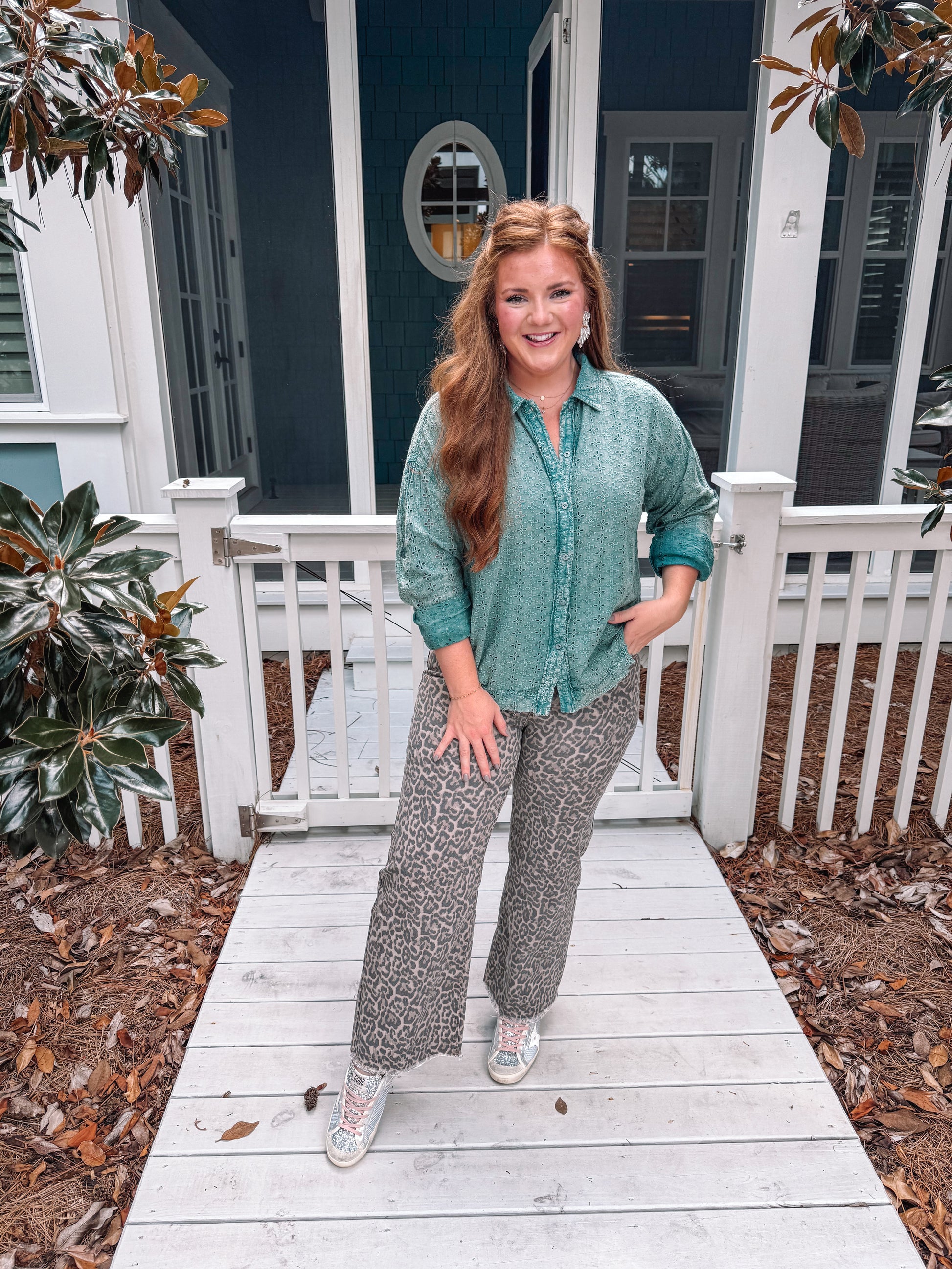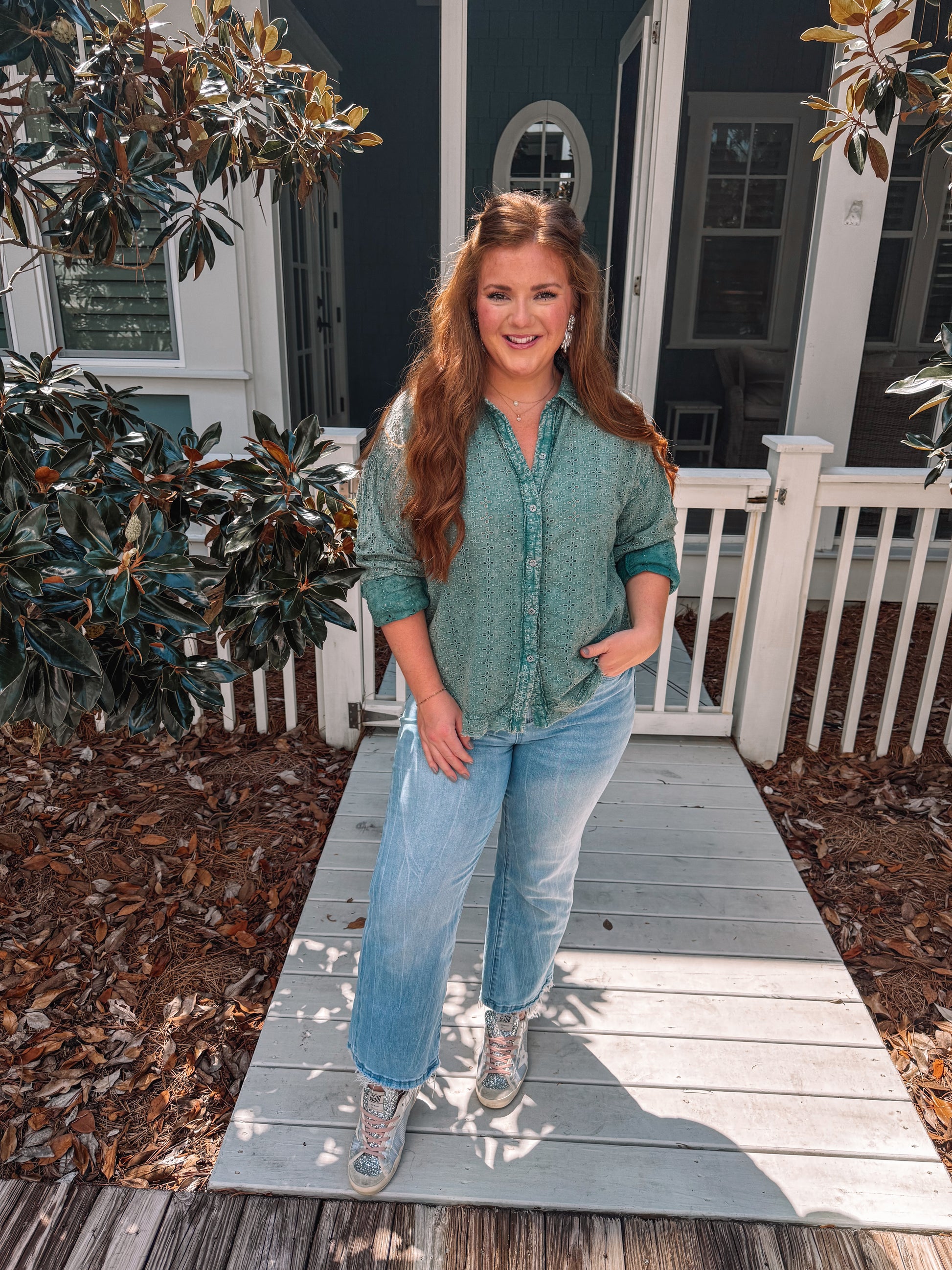 Experience timeless style with this Flower Eyelet Pattern Mineral Washed Button Up. Crafted in a vintage green shade, its soft mineral wash offers a comfortable, worn-in feel while the delicate eyelet floral design adds a charming, feminine touch. Perfect for layering or wearing solo, this shirt effortlessly blends casual ease with elegant details, making it a versatile addition to your wardrobe that elevates any look.