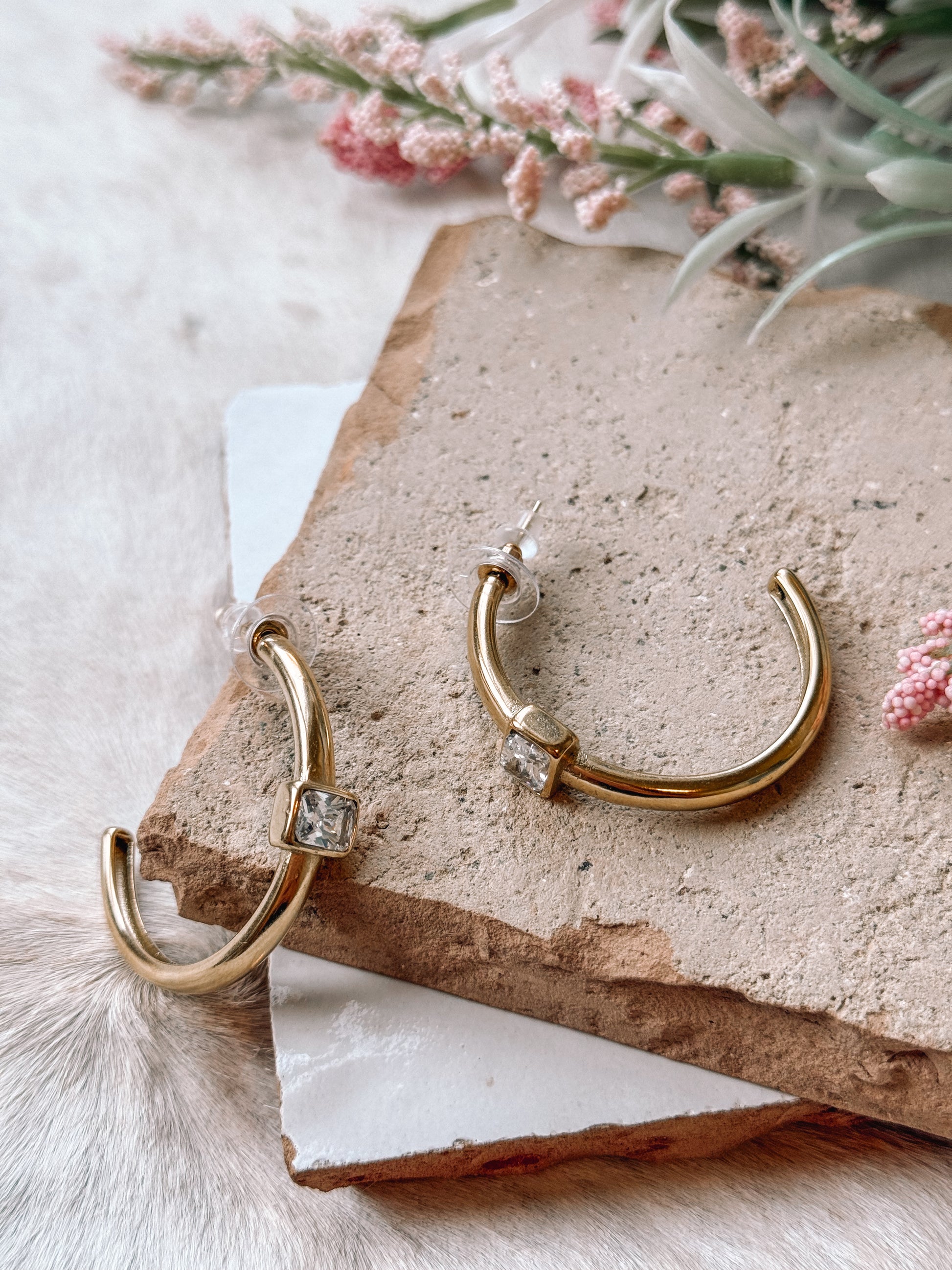 The Gigi Earrings are the perfect blend of modern elegance and everyday sophistication. Crafted in gold stainless with a chic matte finish, these 1.5" mid-sized semi hoop earrings feature a sleek rectangular crystal at the front for a touch of understated sparkle. With a comfortable post-back design, they’re effortlessly stylish and easy to wear. Timeless, versatile, and made to last, the Gigi Earrings are your new go-to for elevating any outfit.