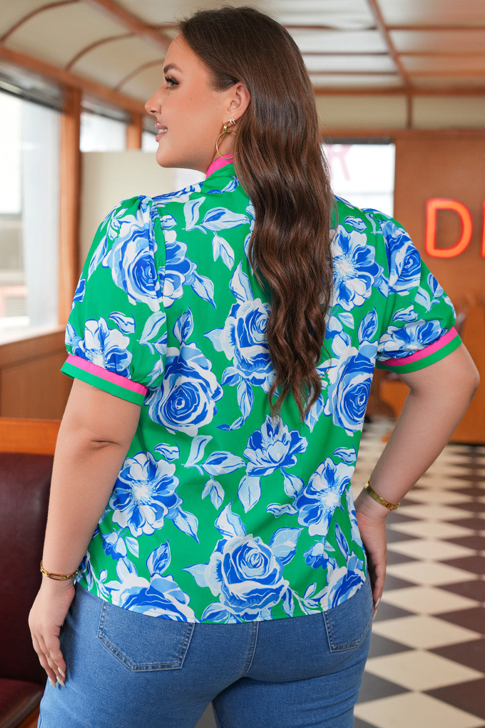 Green Floral Print Short Puff Sleeve Plus Size Top