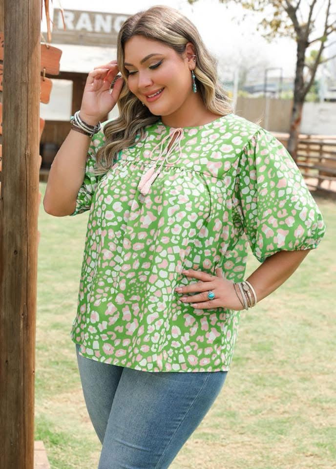 Green Plus Size Floral Tassel Tie Split Neck Puff Sleeve Blouse - PREORDER