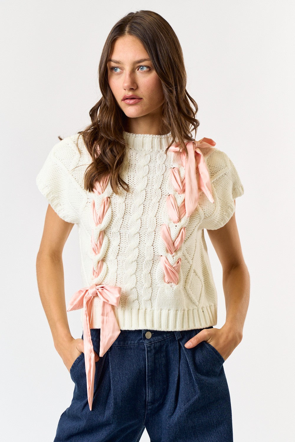 Introducing the Hadly Satin Bow Sweater Tank - a stylish addition to your wardrobe! With a luxurious satin bow and cable knit design, this top exudes pure elegance. Stay effortlessly chic for any event in this must-have sweater vest.