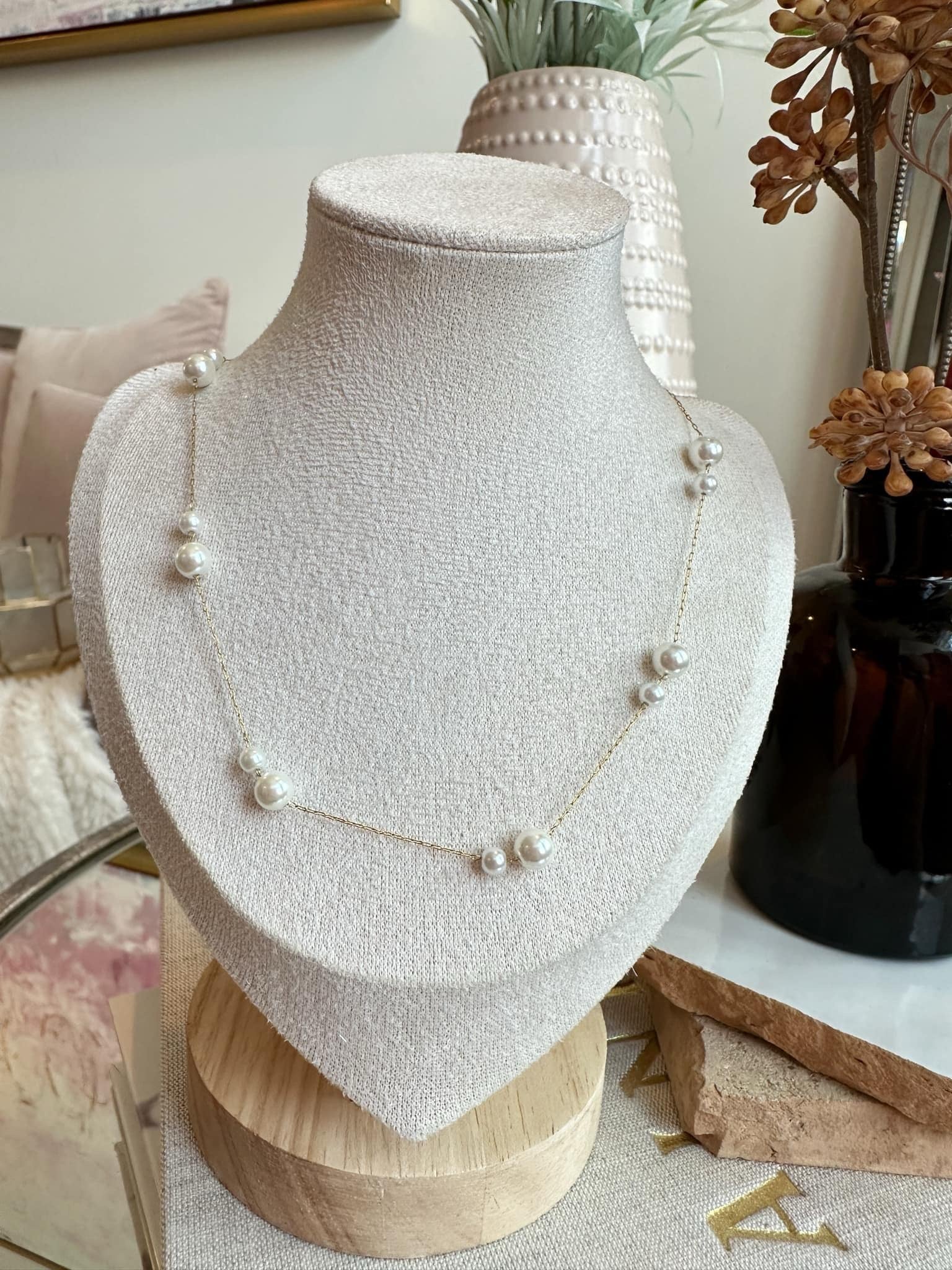 Elevate your jewelry game with the Haven Necklace. This timeless piece showcases a delicate gold stainless chain and scattered faux pearls that effortlessly exude grace and sophistication. With its adjustable length and versatile design, it's the perfect accessory for any occasion, adding a touch of elegance to any outfit. Embrace the subtle beauty and elegance of the Haven Necklace.
