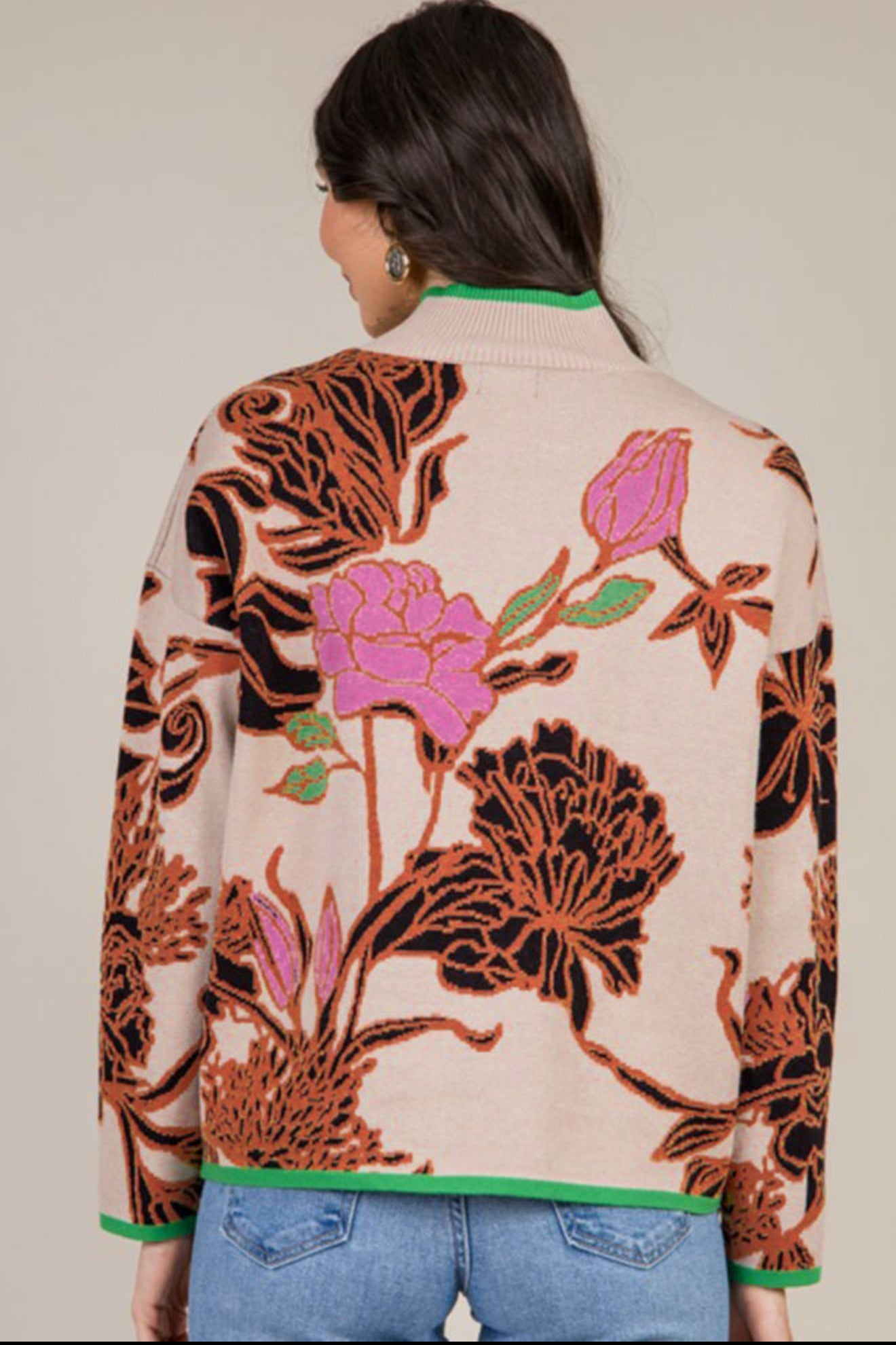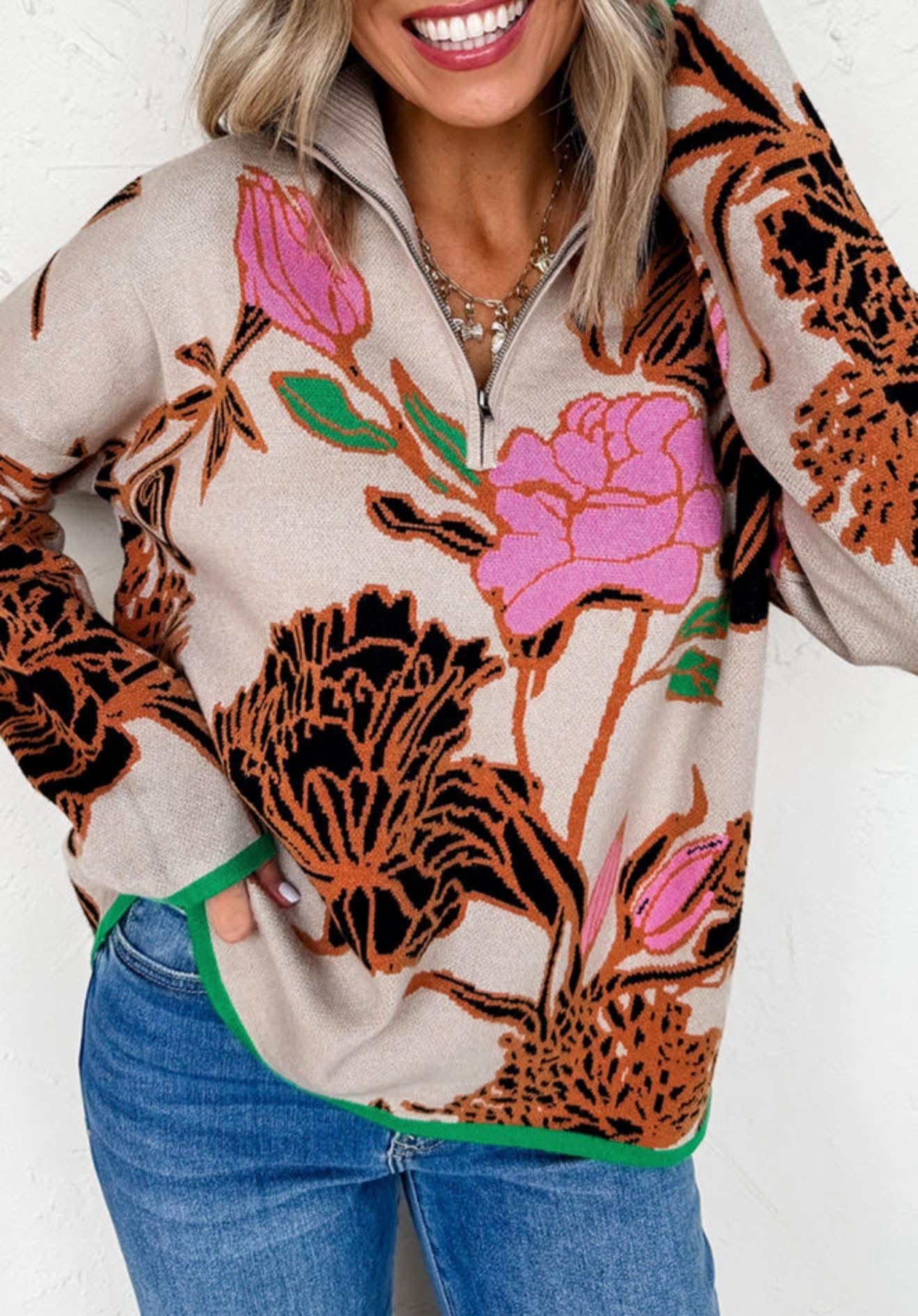 Khaki Floral Pattern Knit Quarter Zip Stand Neck Sweater - PREORDER