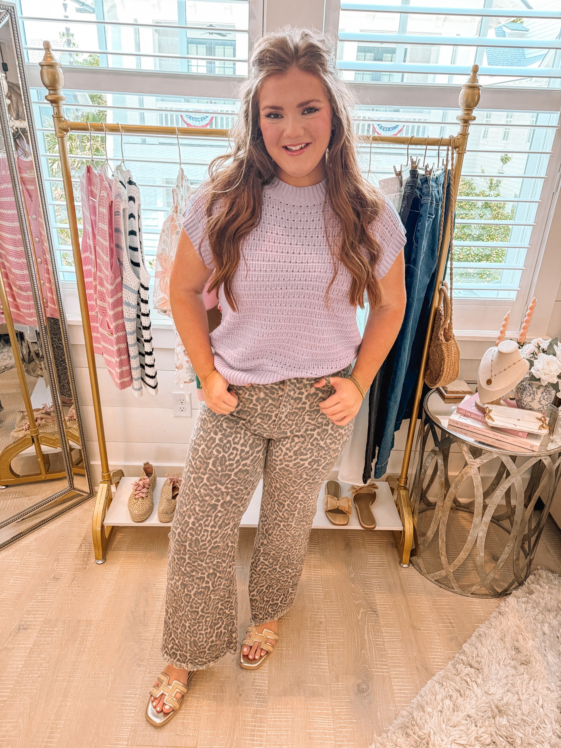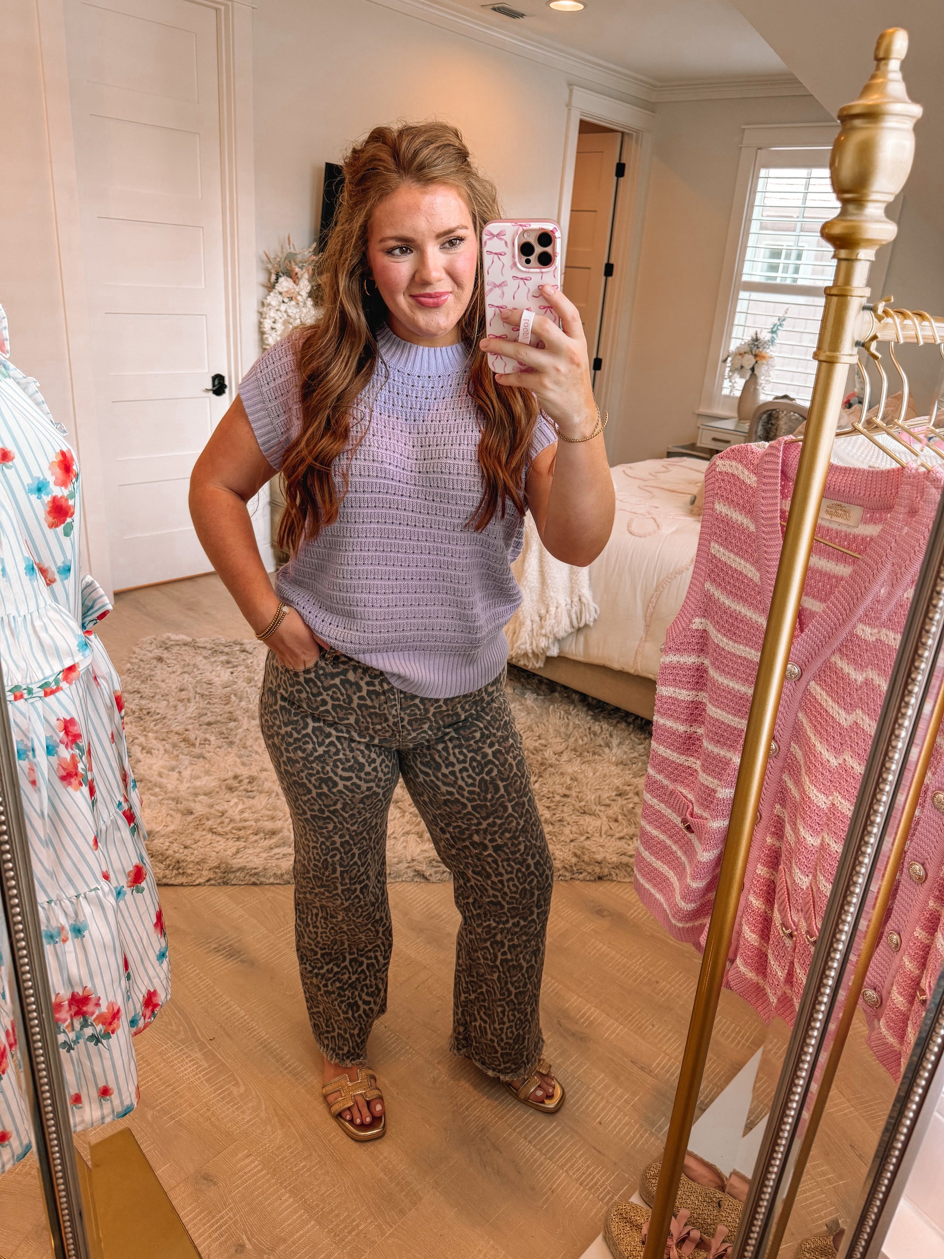 Elevate your wardrobe with our Lavender Pointelle knit Sweater. This short-sleeve design features delicate pointelle detailing and comfortable ribbed trim for a flattering silhouette. The soft lavender hue adds a refreshing touch to your outfit, perfect for both casual outings and dressier occasions. Pair with jeans or a skirt for an effortlessly stylish look.