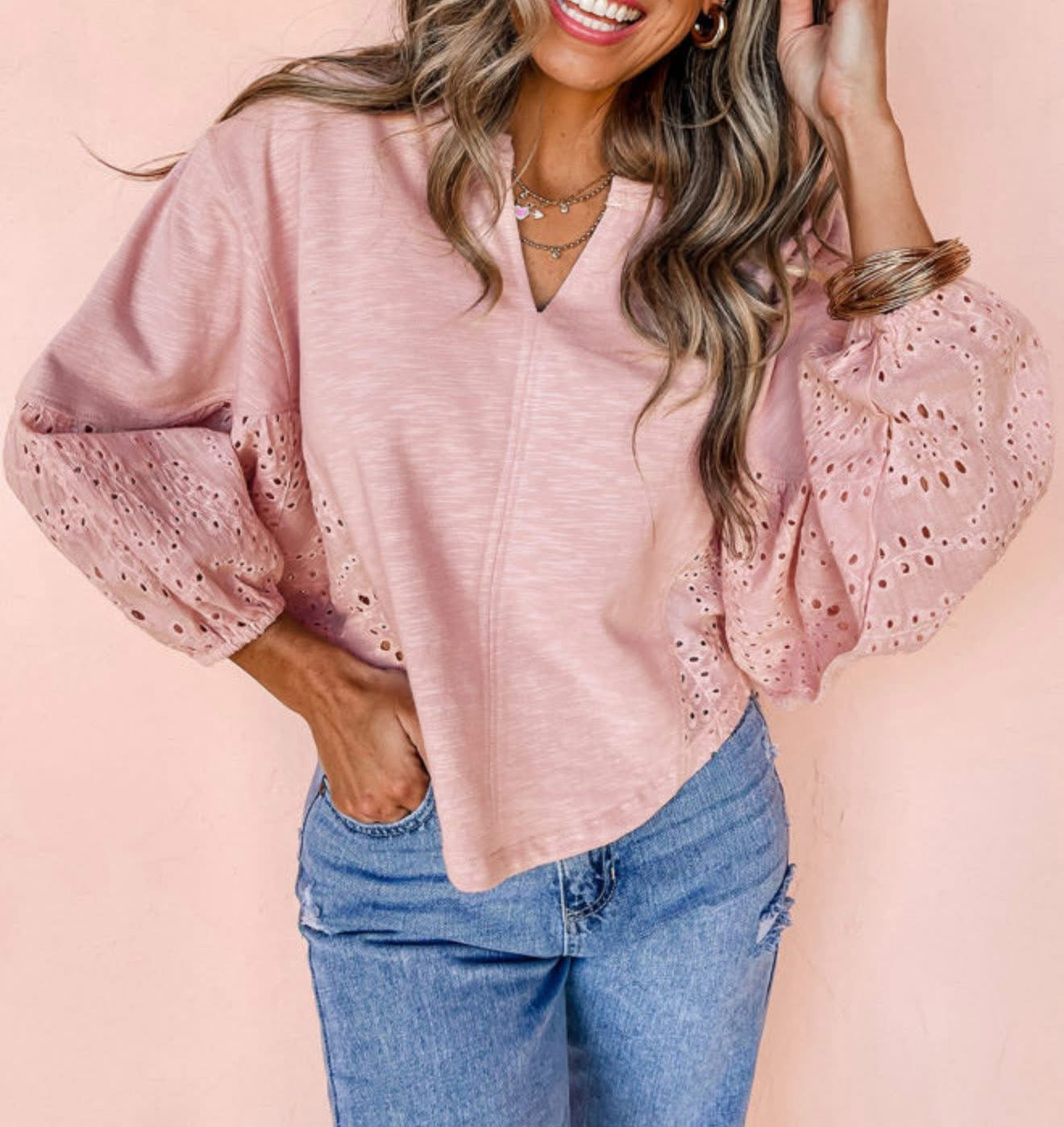Elevate your wardrobe with this Light Pink Keyhole Notch V Neck Blouse, featuring graceful batwing sleeves for a flattering, airy silhouette. The soft pink hue adds a feminine touch, while the keyhole notch neckline invites subtle elegance. Perfect for both casual outings and office wear, this blouse combines comfort and style effortlessly.