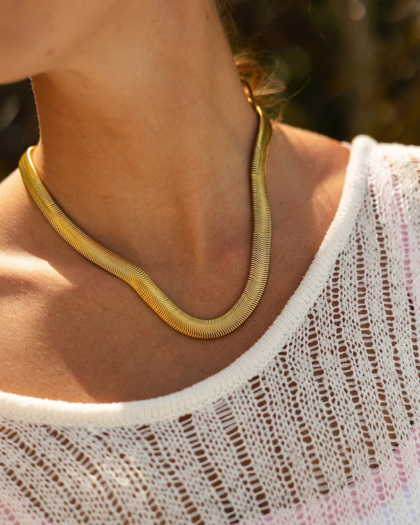 Elevate your style with the Luna Necklace, a striking stainless steel snake chain that shines with a sleek, high-gloss finish. Its oversized design drapes smoothly against your skin, adding a touch of modern elegance to any outfit. Adjustable from 17" to 20" with a secure lobster claw clasp, it ensures a comfortable, customizable fit. Whether worn alone or layered, the Luna Necklace is the perfect statement piece to enhance your jewelry collection. Preorder now to own this effortlessly sophisticated accessory.