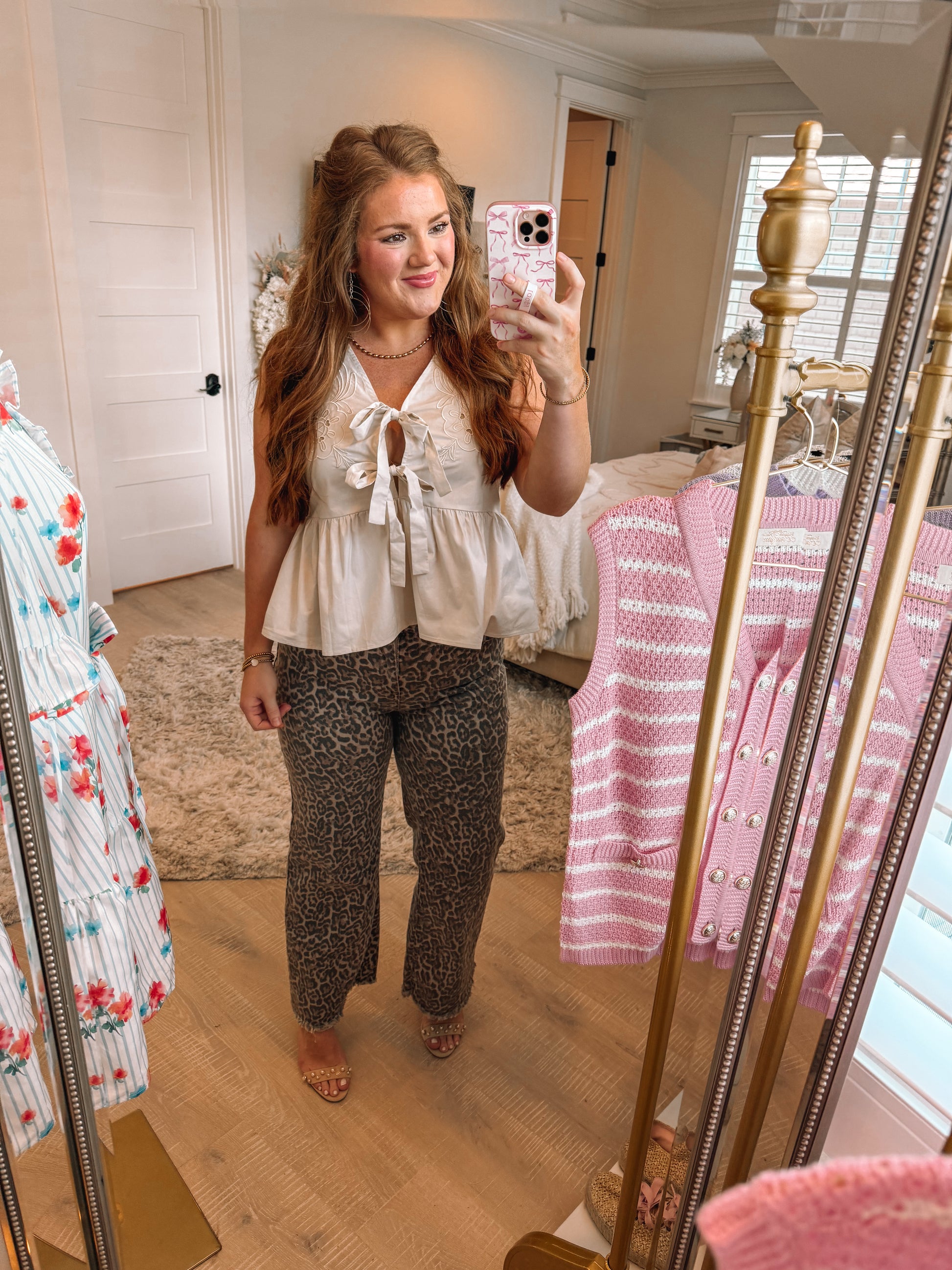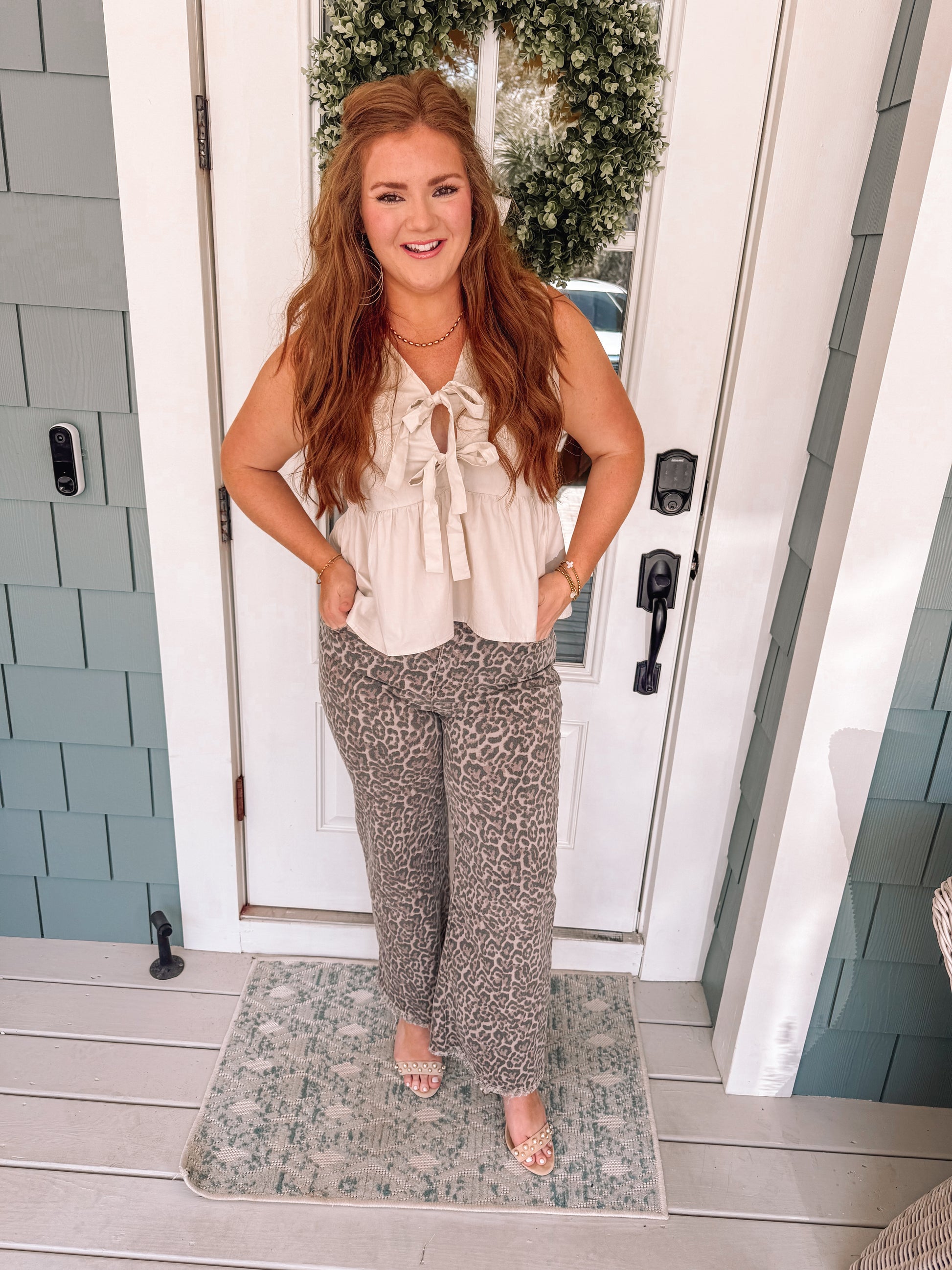 Parchment Hollow Out Embroidered Flower Knot Front V Neck Tank Top - PREORDER