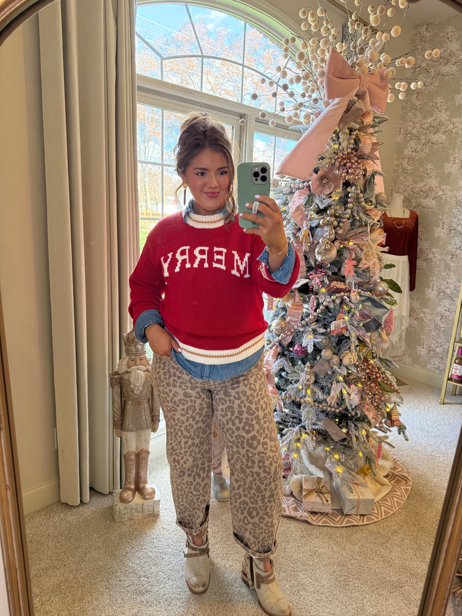 Wrap yourself in festive comfort with this striking red MERRY color block sweater. The eye-catching edge detailing and relaxed drop shoulder silhouette create an effortlessly chic look that transitions seamlessly from casual gatherings to cozy nights in. Crafted for softness and style, this sweater becomes an instant wardrobe essential that pairs beautifully with your favorite denim or joggers. Perfect for the season, it's the piece you'll reach for again and again.