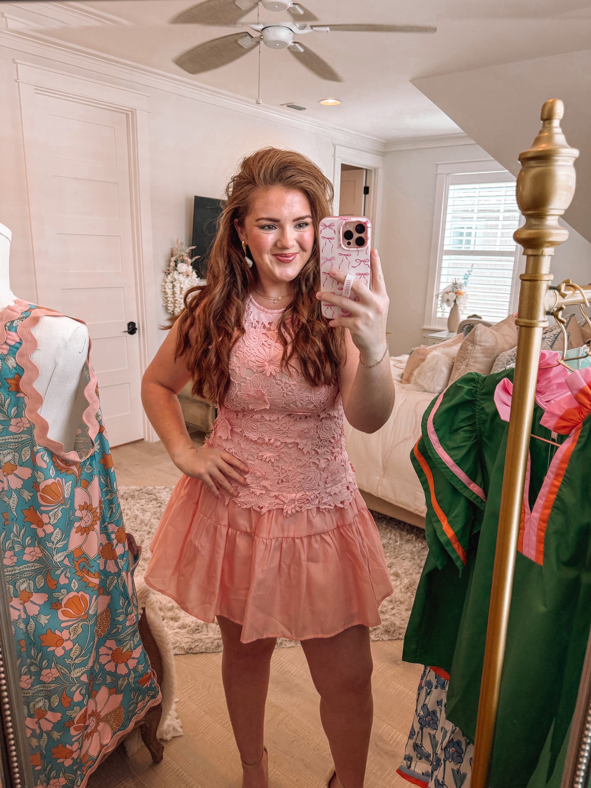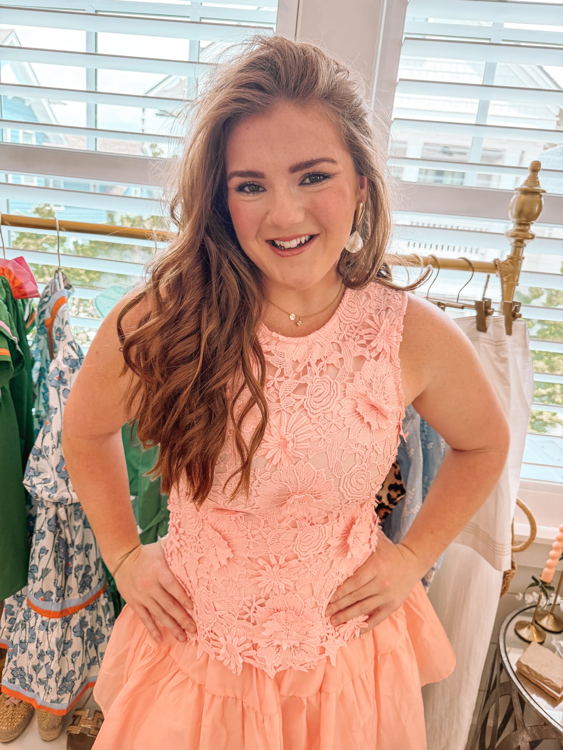 Experience elegance and beauty with our Sleeveless Floral Lace Tiered Mini Dress. The round neckline and sleeveless design create a flattering silhouette, while the allover floral lace pattern and 3D floral accents add a touch of whimsy. The fitted bodice and flared mini skirt provide a contrast of structure and flow. Complete the look with the keyhole back and tie detail.
