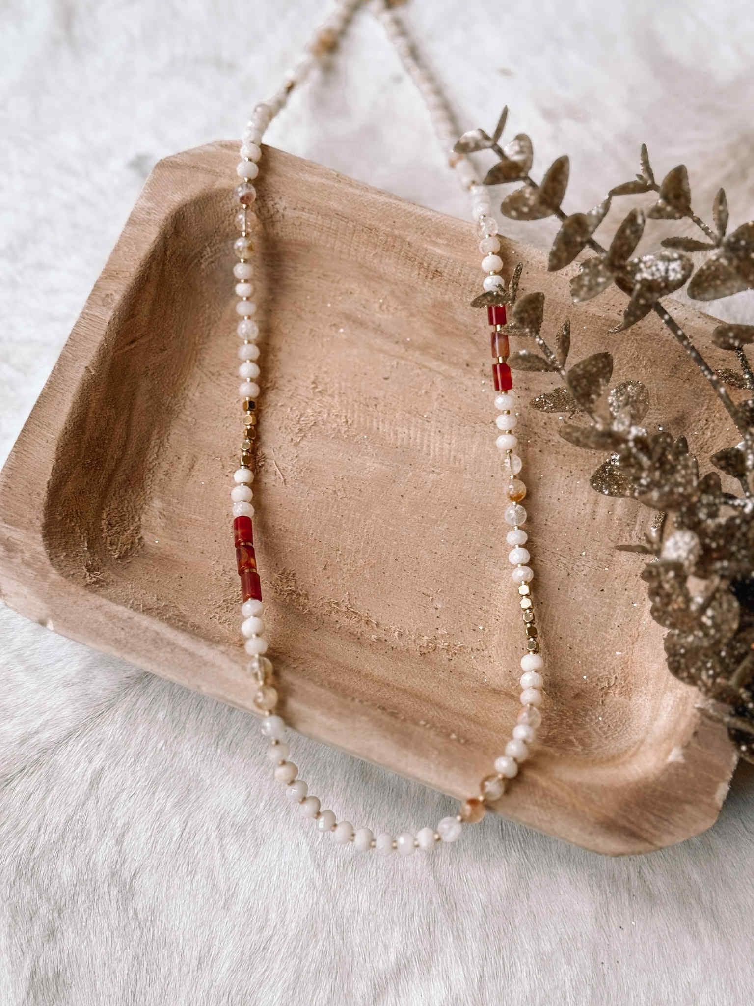 The Sundance Necklace radiates warmth and elegance with its unique blend of glass, stainless steel, red agate, citrine, and crystal beads in peach, white, gold, and red tones. Crafted in gold stainless steel, this adjustable necklace (27"-30") offers versatile styling options—wear it long, double wrapped for a layered effect, or add a charm to create a personalized centerpiece. Perfect for adding earthy charm and sophistication, it complements any outfit effortlessly, whether worn alone or stacked. Elevate your look with the timeless appeal of the Sundance Necklace.