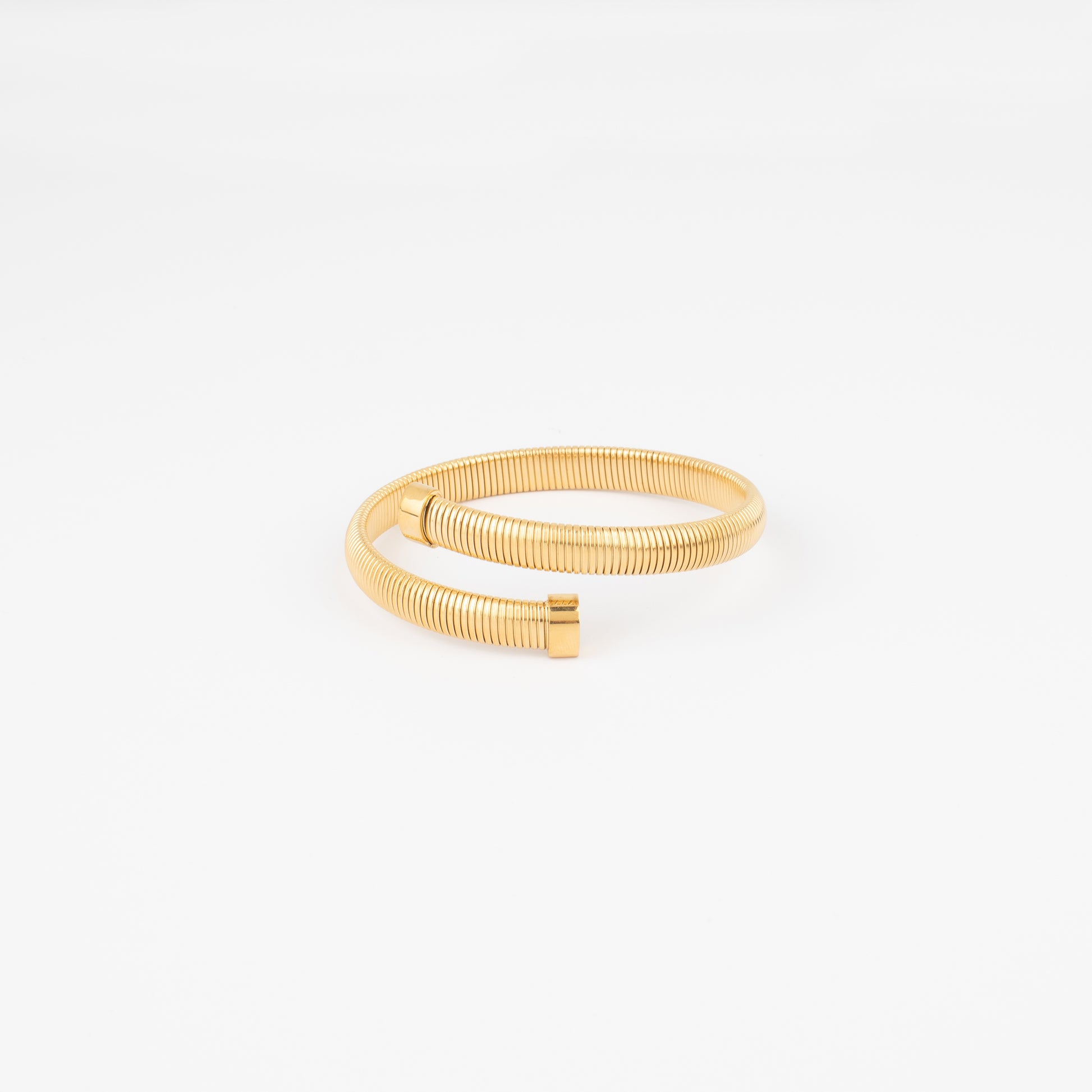 Elevate your accessory game with the Tamia Bracelet, a stunning coiled cuff design that combines timeless elegance with modern flair. Crafted from gold stainless steel, this versatile piece adjusts perfectly to your wrist for all-day comfort. Its sophisticated overlapping style makes a statement whether worn alone or layered with other pieces. Transform any outfit from ordinary to extraordinary with this essential bracelet that transitions effortlessly from day to night.