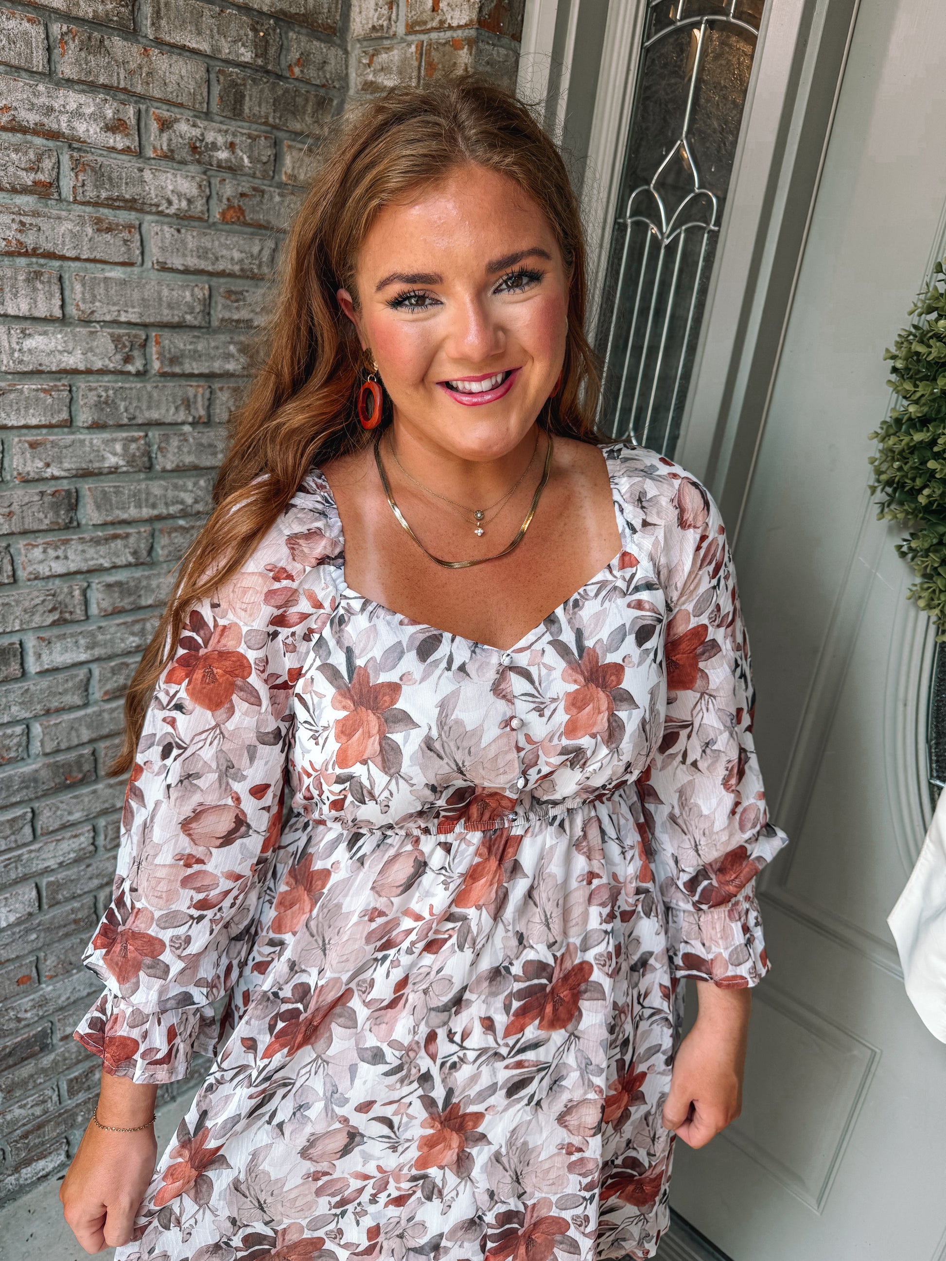 White Floral Print Sweetheart Neck Long Sleeve High Waist Mini Dress - PREORDER