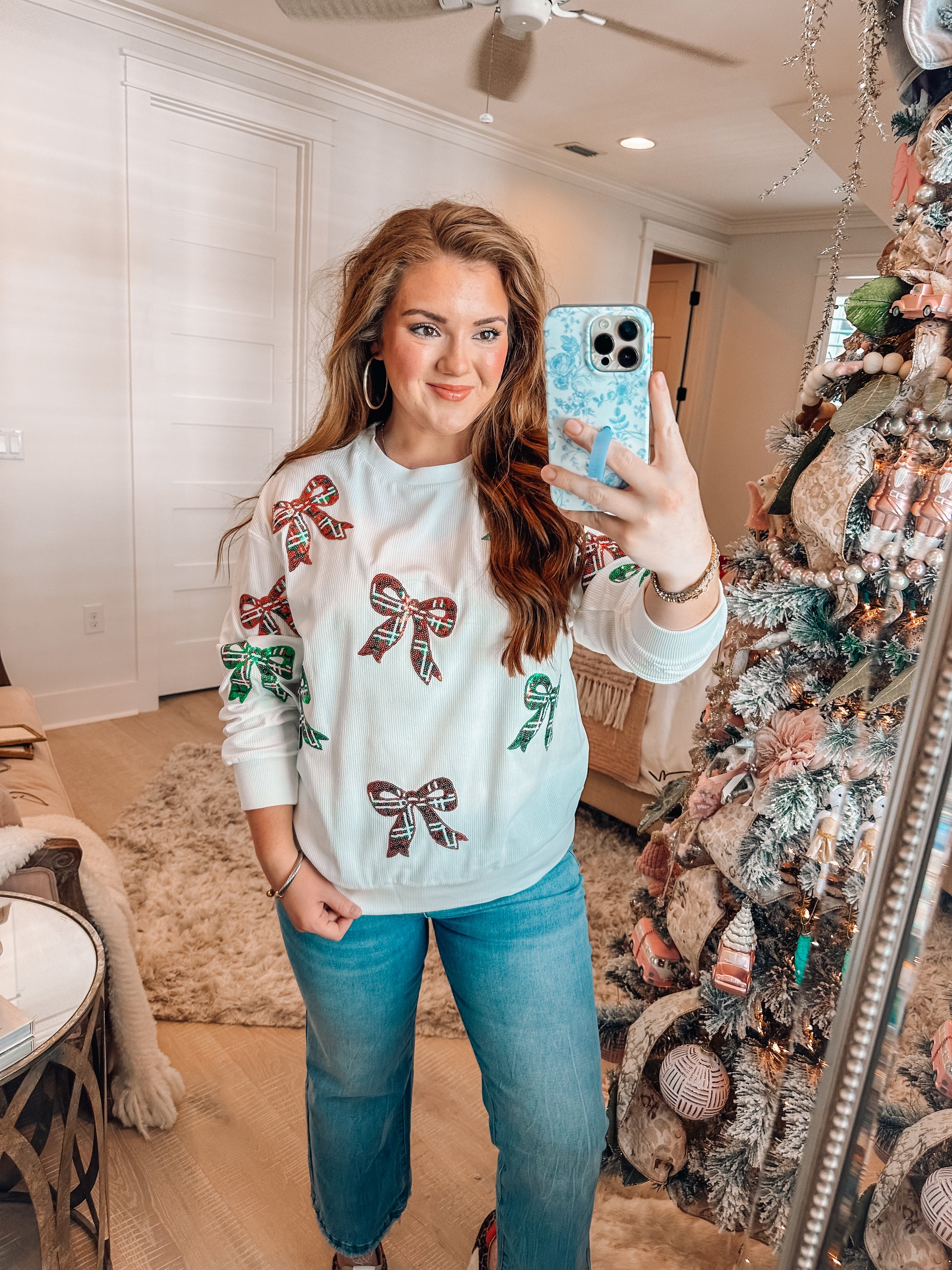 White Plaid Bowknot Sequin Pattern Corded Oversized Sweatshirt