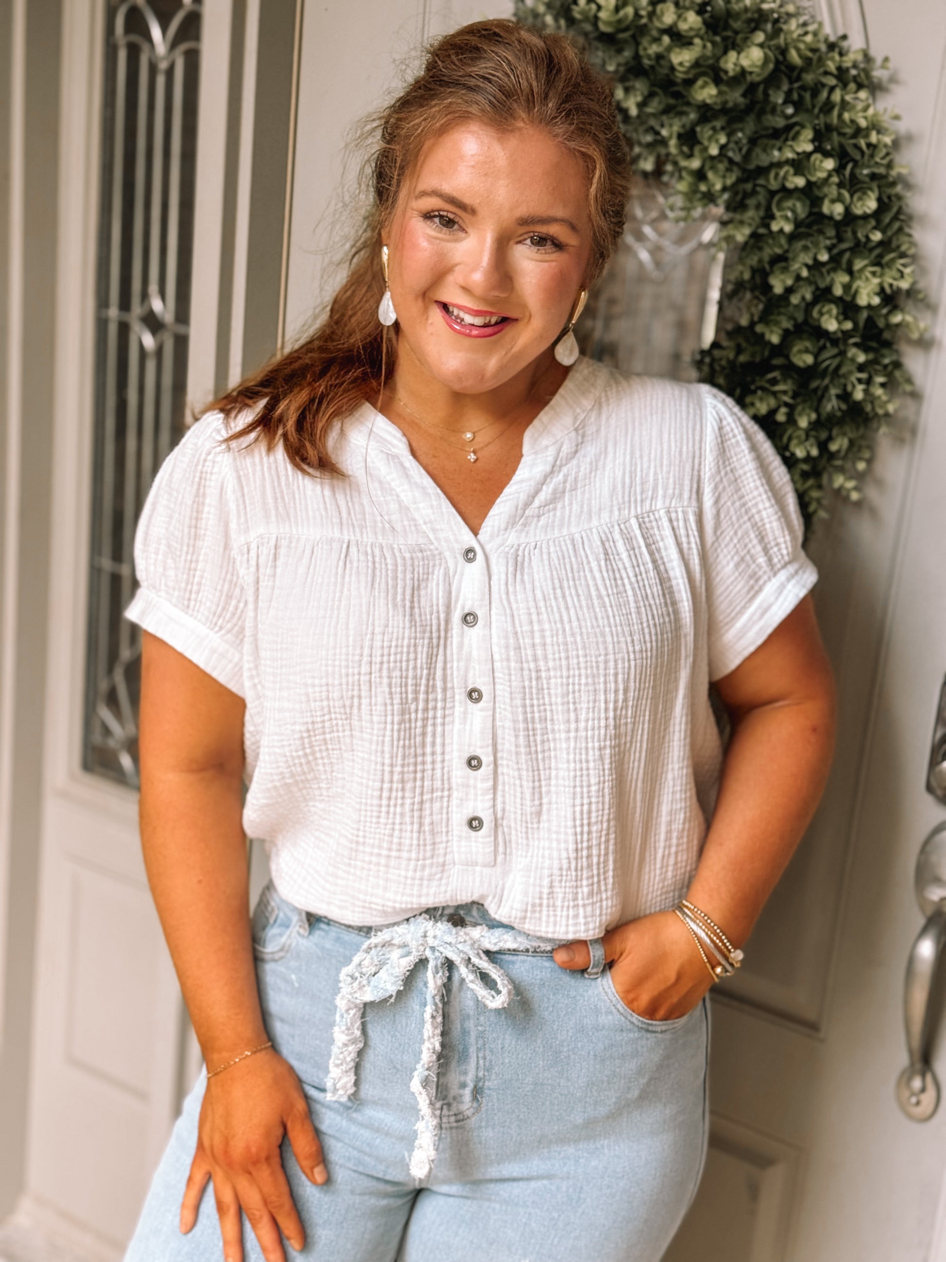 Experience comfort and style with this White Textured Short Sleeve Blouse, crafted from 100% breathable cotton. Featuring charming buttons and trendy frayed edges, it offers a fresh, casual look perfect for warm days. Preorder now to add this versatile, lightweight piece to your collection and enjoy effortless elegance all season long.
