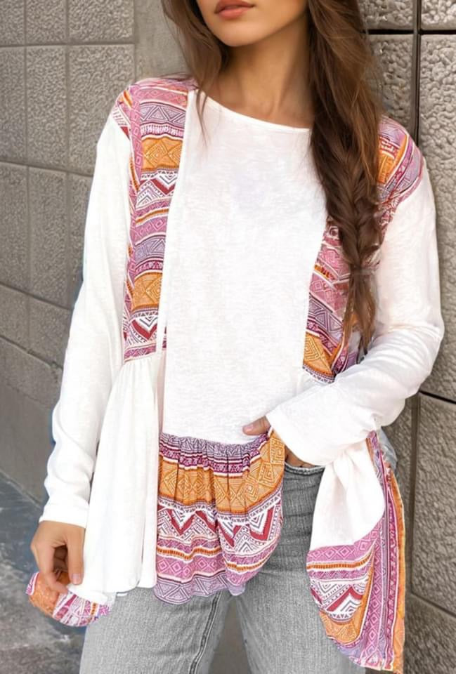 White Western Aztec Print Patchwork Ruffled Tunic Long Sleeve Babydoll Top PREORDER