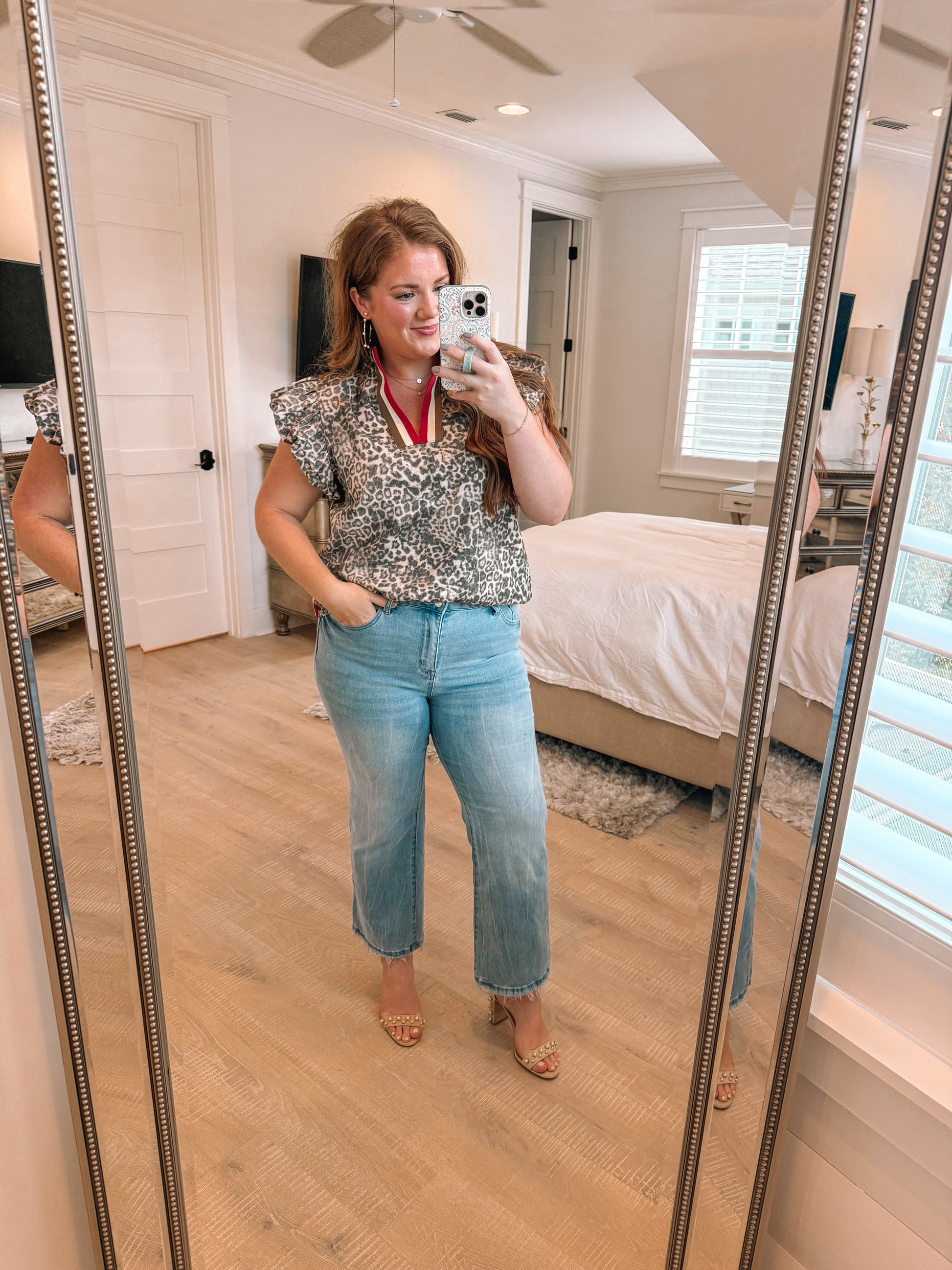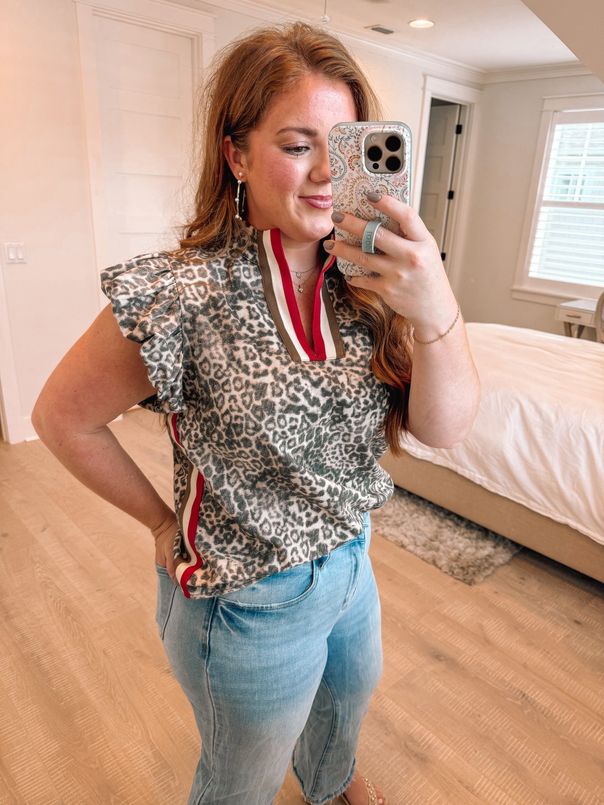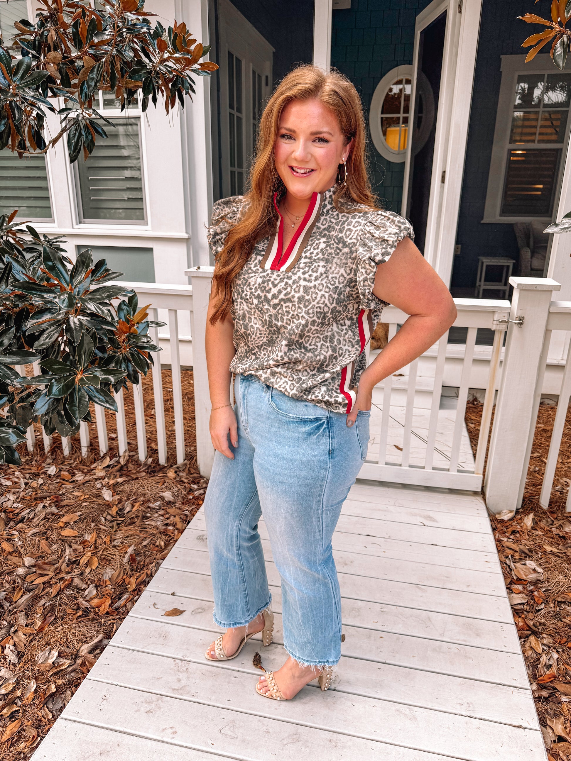 Embrace bold style with the Wild Thing Leopard Top, designed to turn heads. This lightweight, woven pullover features eye-catching leopard print complemented by multicolor accents on the high band collar and slit neck. The flutter sleeves add a playful, feminine touch, while the side slits enhance comfort and movement. Unlined and non-sheer, it offers both style and ease for any occasion. Perfect for those who want to make a confident fashion statement effortlessly.