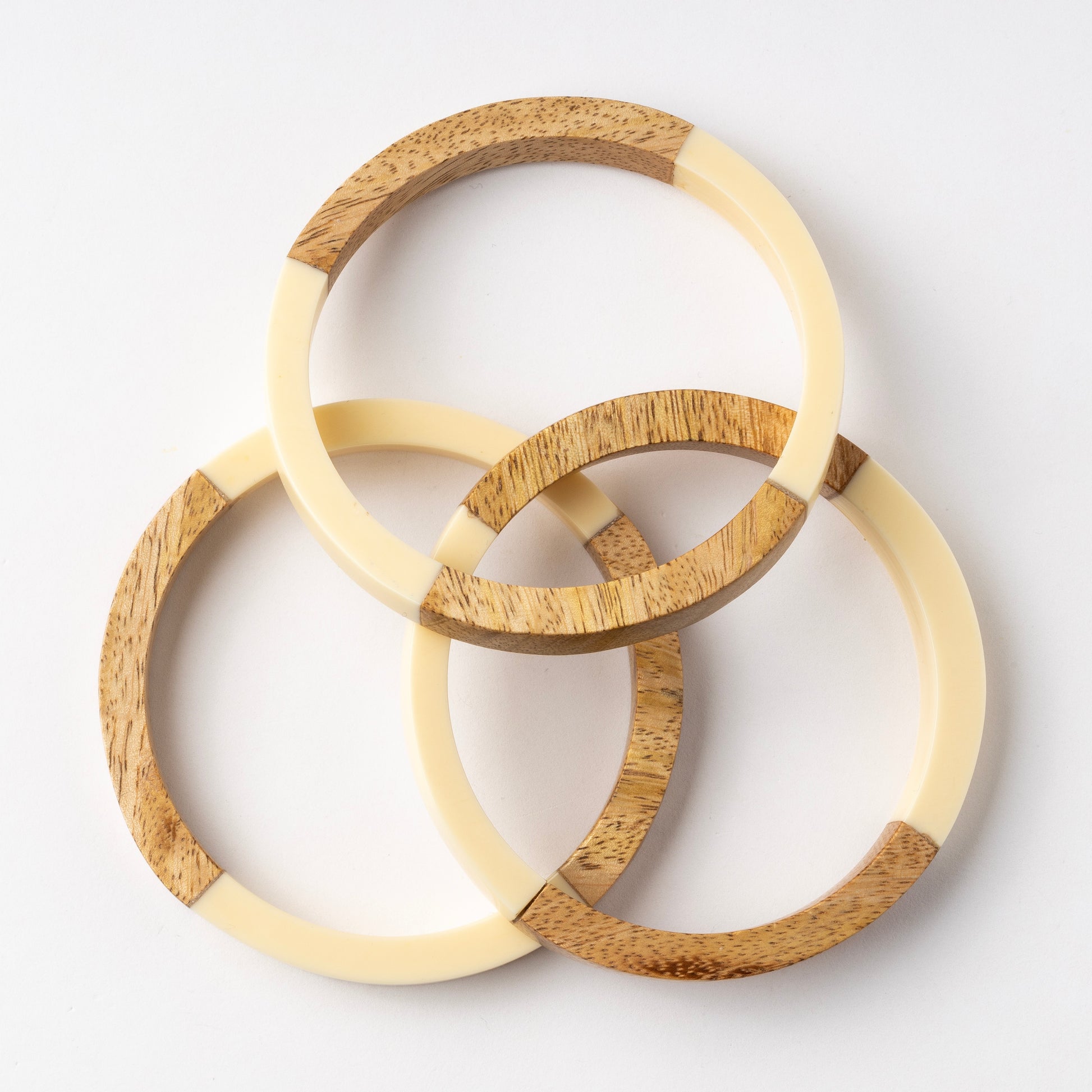 Stay in style and rock these 3 natural wood and acrylic bracelets, complete with cream accents. Measuring at a comfortable 8 inches, this set will add a touch of earthy elegance to any outfit.