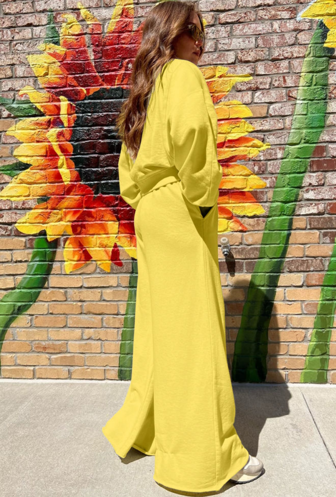Elevate your style with this Yellow Cream Set featuring a drop shoulder puff sleeve crop pullover and wide leg pants with a convenient drawstring. The vibrant color and relaxed fit combine comfort with bold fashion, making it perfect for standout casual looks or chic lounging. Embrace effortless confidence and eye-catching appeal in one complete outfit.